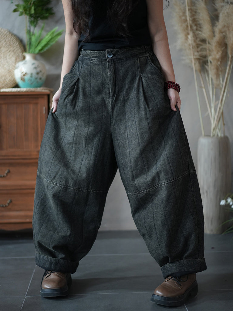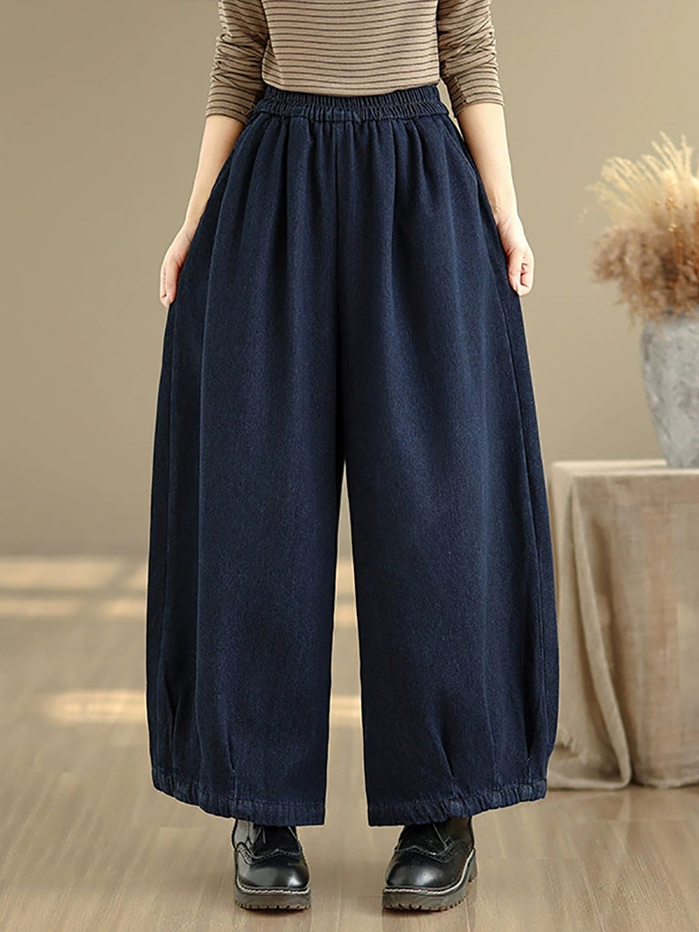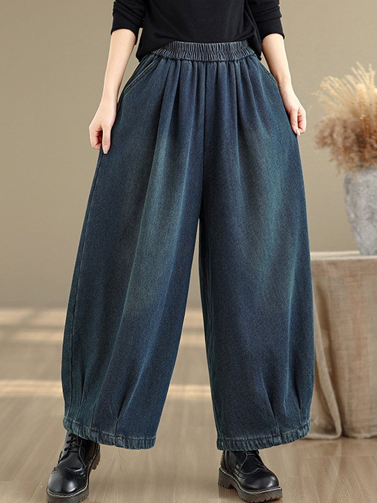Women Winter Retro Denim Fleece-lined Wide-leg Pants