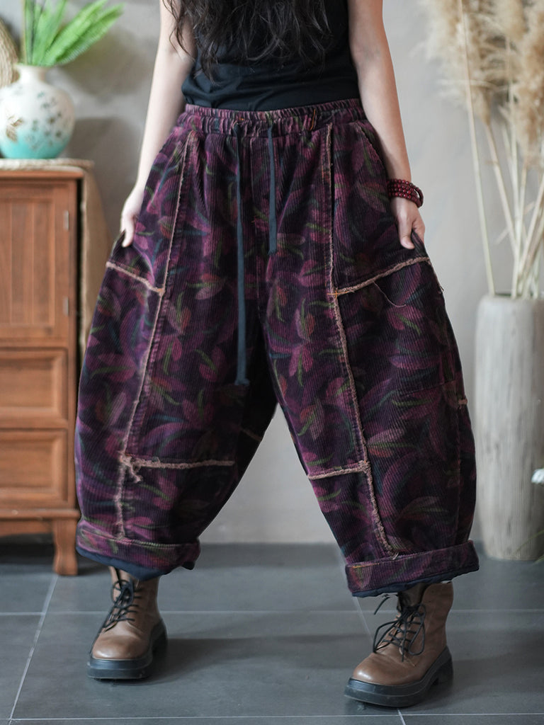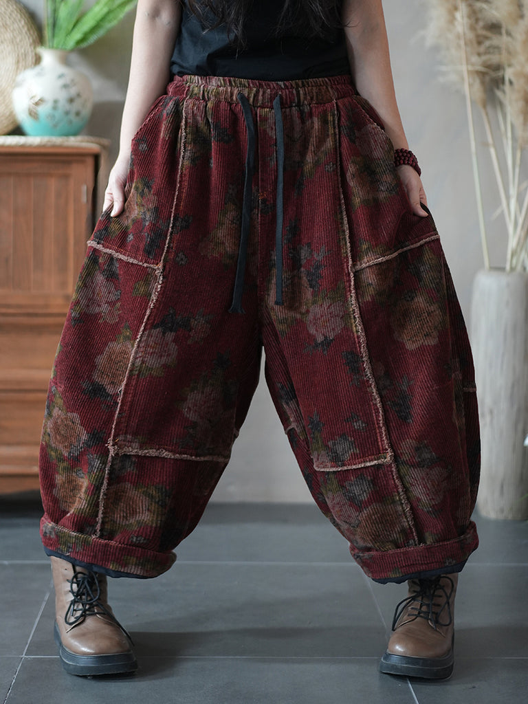 Women Winter Retro Corduroy Flower Spliced Harem Pants