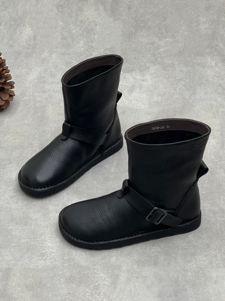 Women Vintage Pure Color Leather Fleece-lined Boots