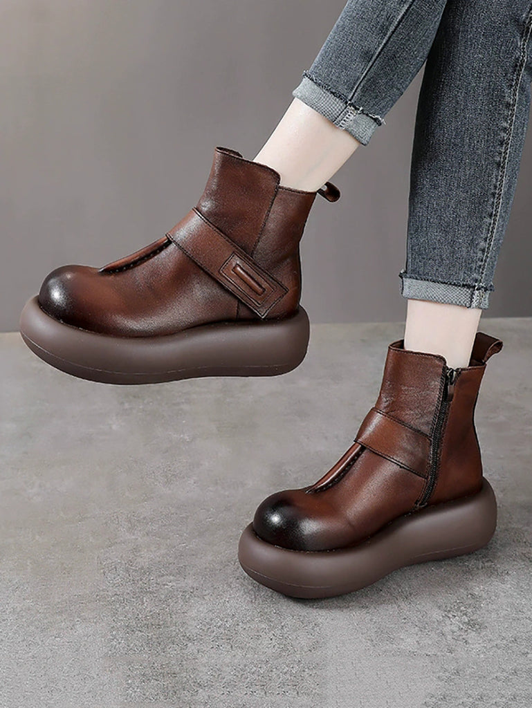 Women Vintage Pure Color Leather Plaform Ankle Boots