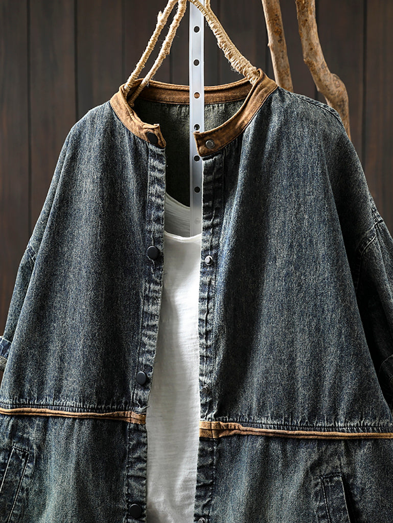 Women Summer Casual Colorblock O-Neck Denim Shirt