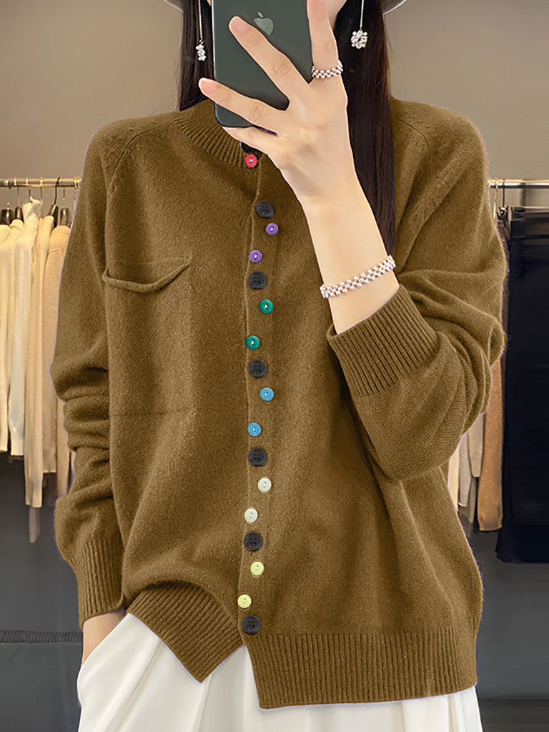 Women Autumn Colorful Button O-Neck Cotton Sweater