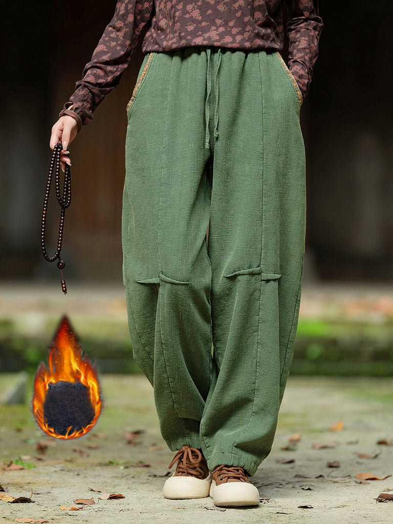 Plus Size Women Vintage Autumn Solid Ramie Padded Wide-leg Pants