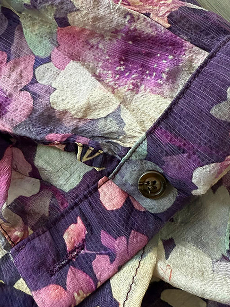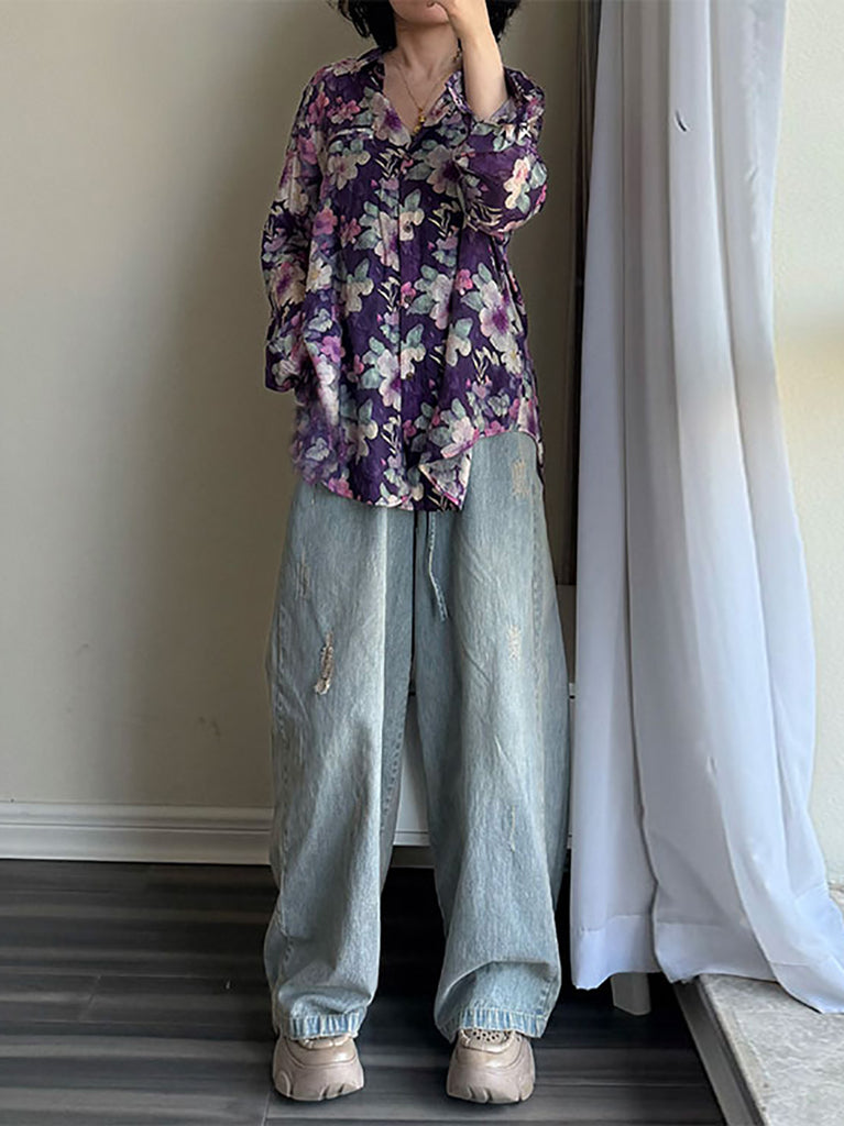 Plus Size Women Summer Artsy Flower Turn-down Collar Long Sleeve Shirt