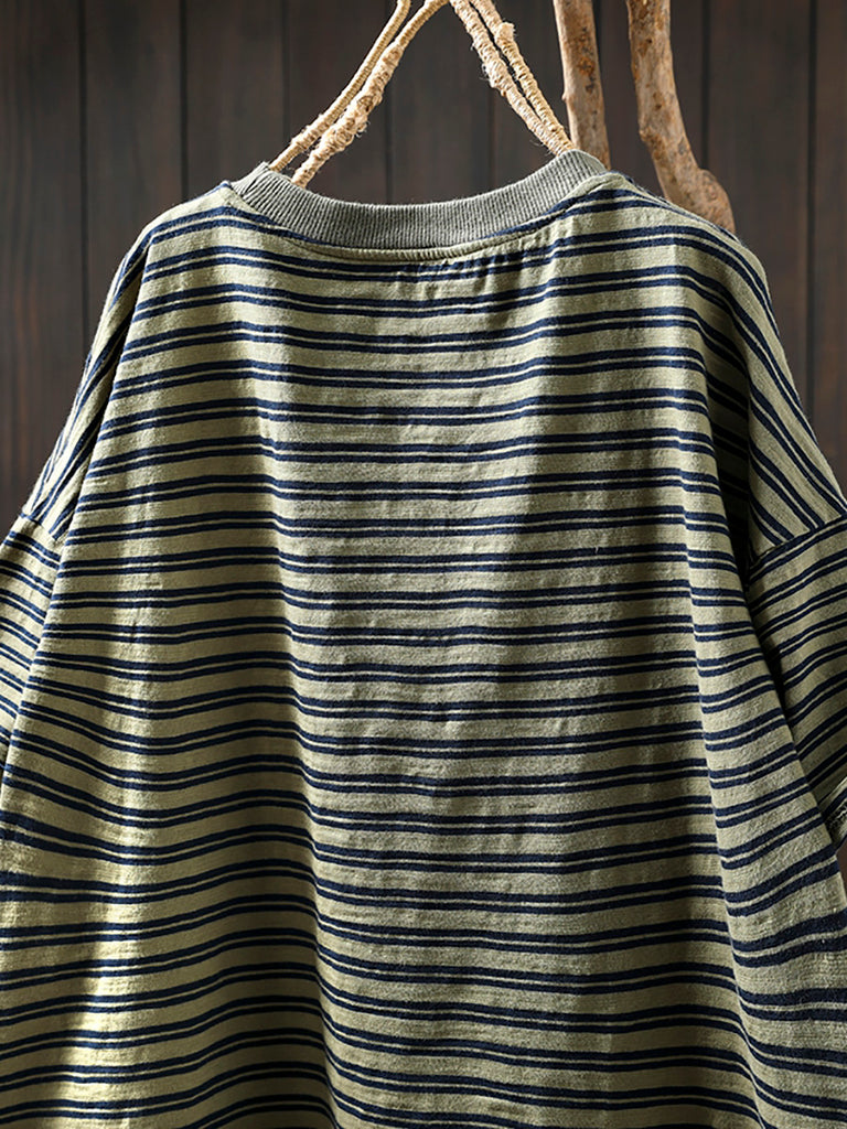 Women Summer Casual Stripe 100%Cotton O-Neck Shirt