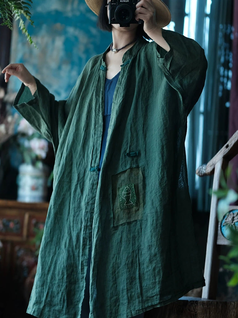 Women Summer Ethnic Solid Linen Button Loose Shirt