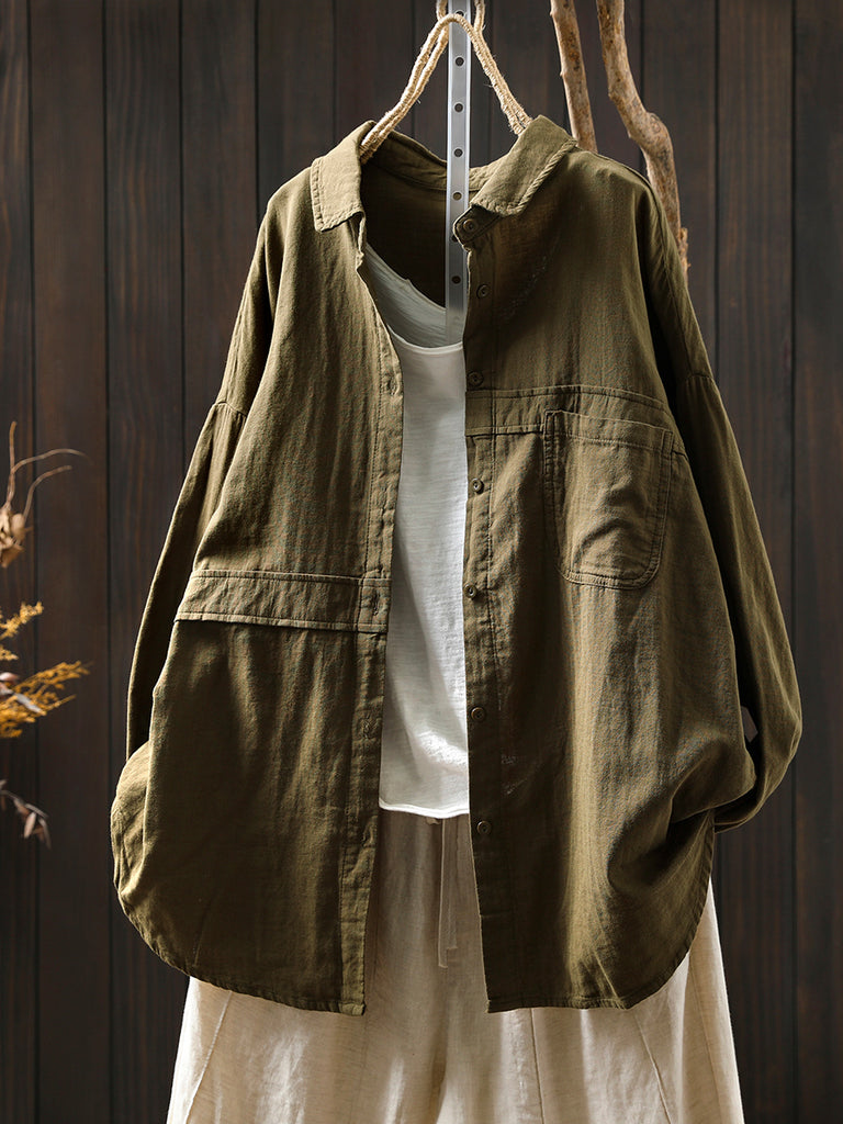 Women Retro Autumn Pure Color 100%Cotton Shirt