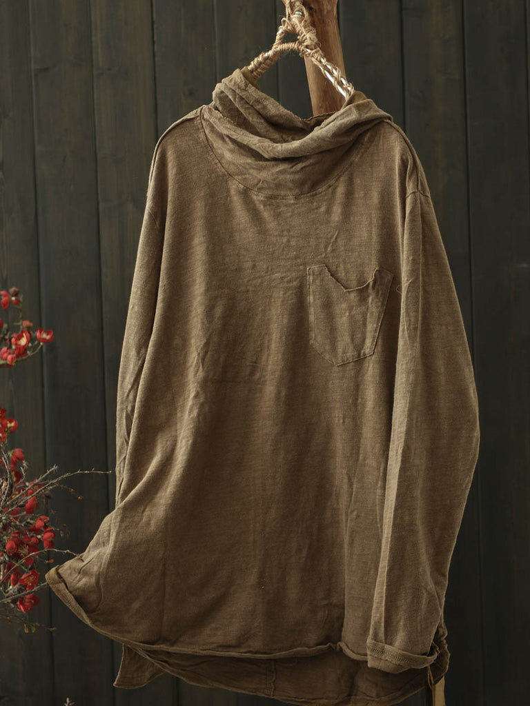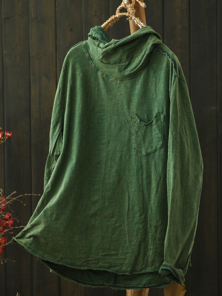 Women Winter Retro Pure Color Cotton Hooded Blouse