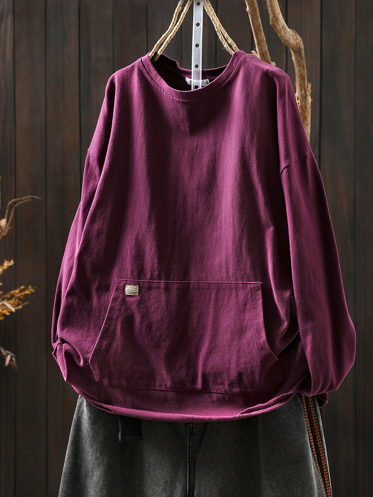 Women Autumn Casual Pure Color Spliced 100%Cotton Sweatshirt