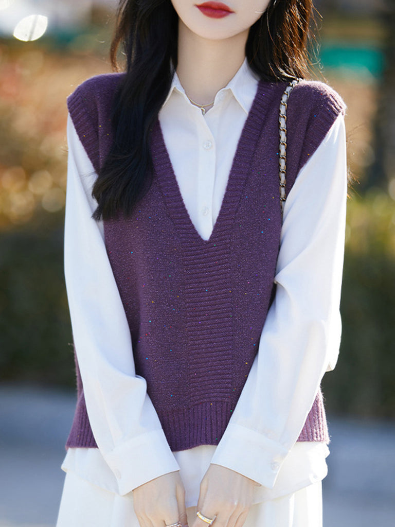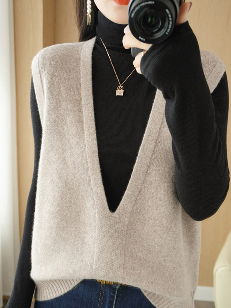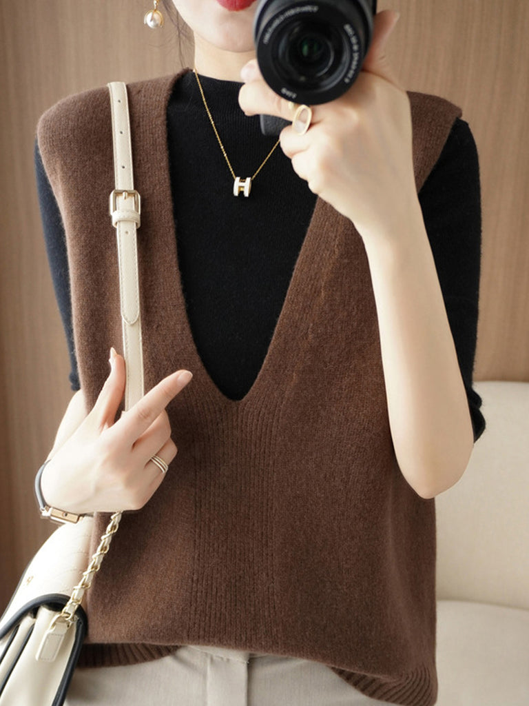 Women Autumn Artsy Pure Color V-Neck Knitted Vest