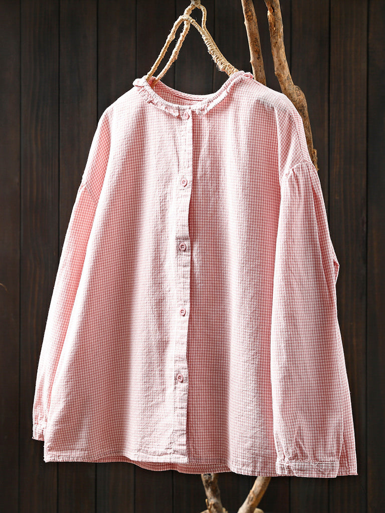 Plus Size Women Summer Artsy Plaid Lace Collar Cotton Shirt