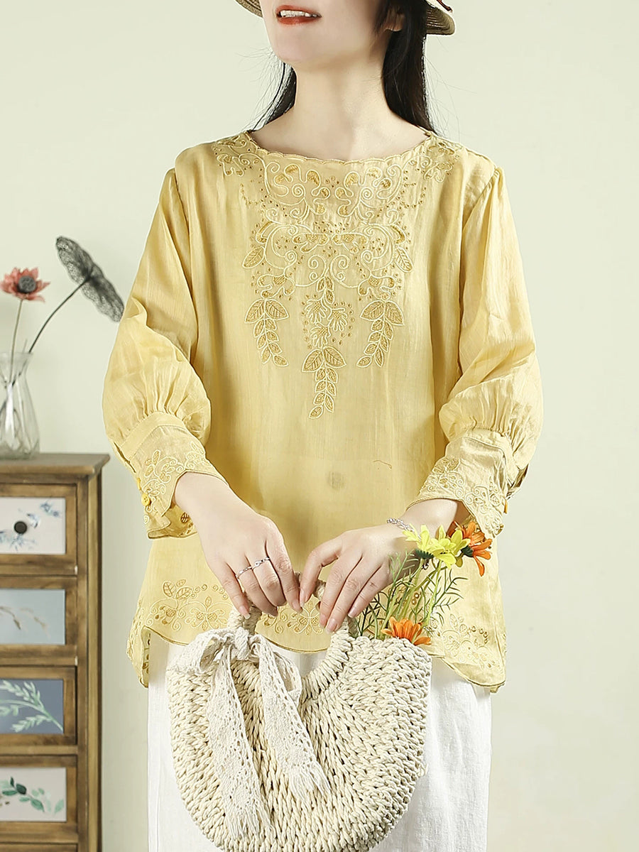 Women Artsy Spring Embroidery O-Neck 100%Ramie Blouse