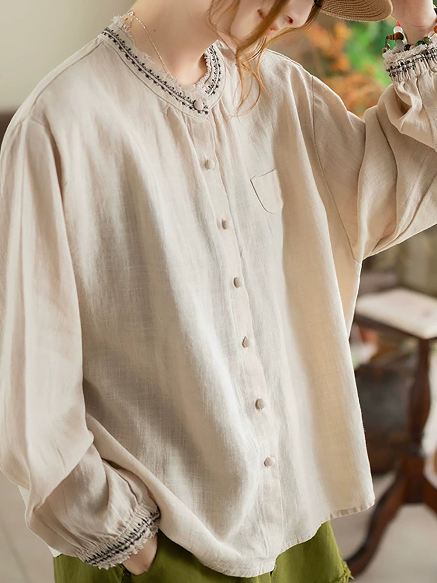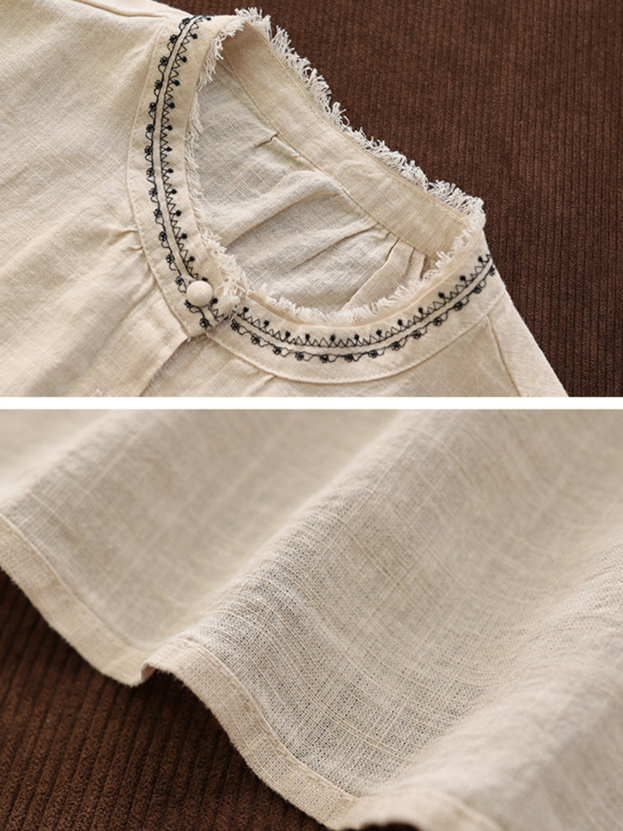 Women Artsy Summer Embroidery O-Neck Ramie Blouse
