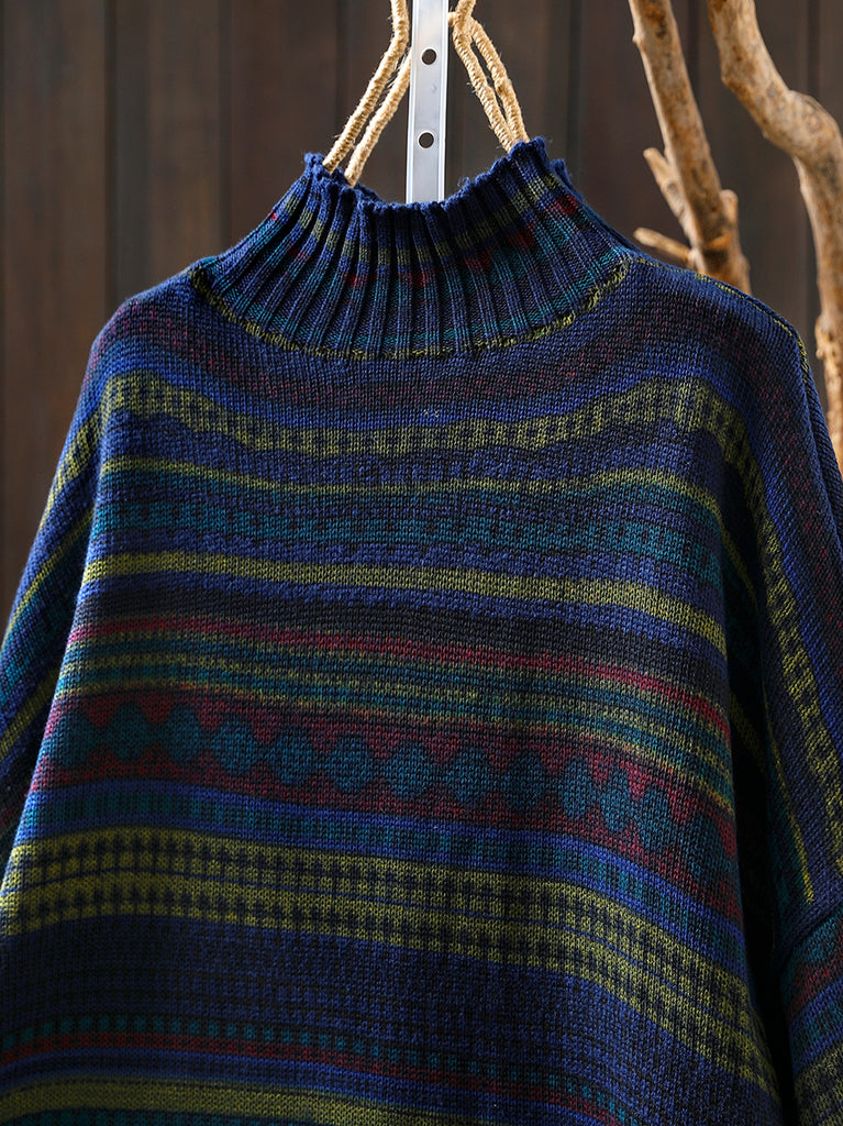 Women Autumn Vintage Stripe Half-Turtleneck Sweater