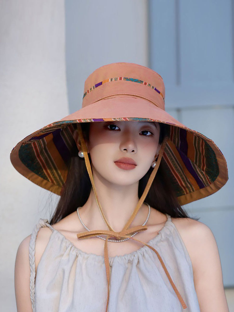 Women Ethnic Stripe Colorblock Strap Sunproof Hat