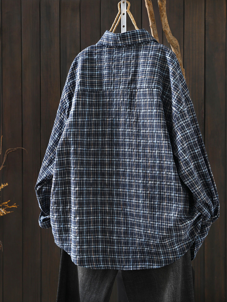 Women Spring Artsy 100%Cotton Plaid Turn-down Collar Shirt