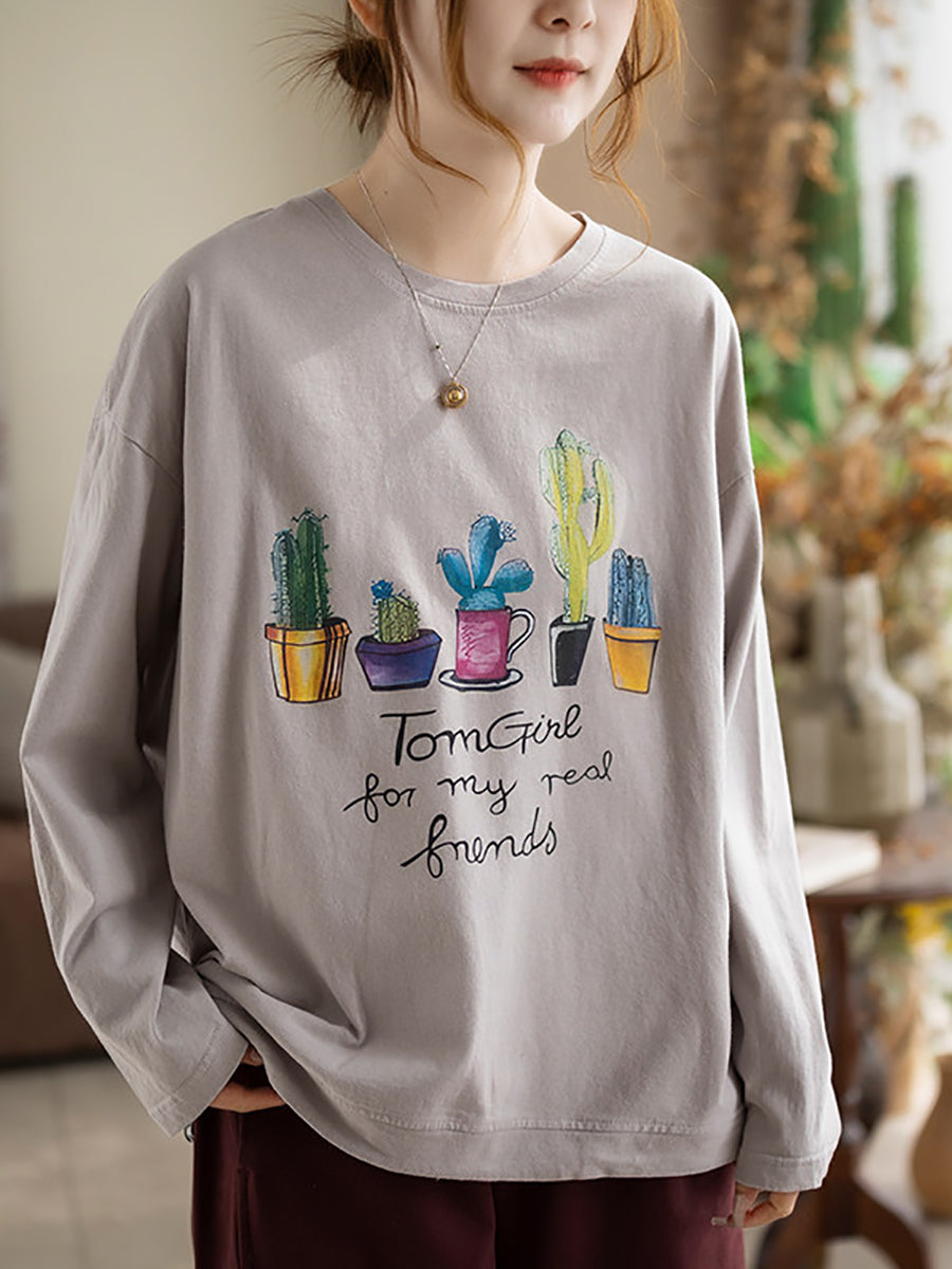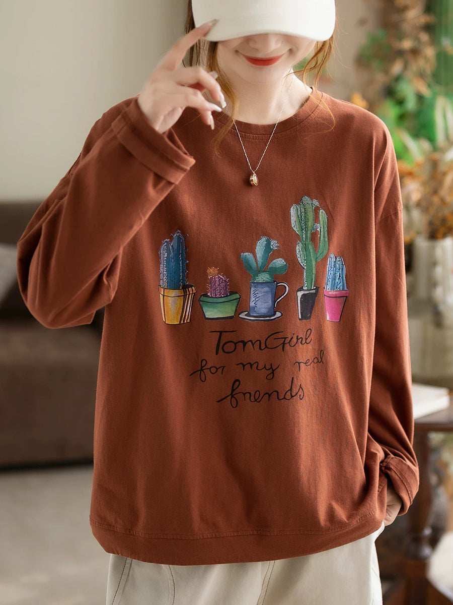 Women Spring Artsy Plants Cotton O-Neck Blouse
