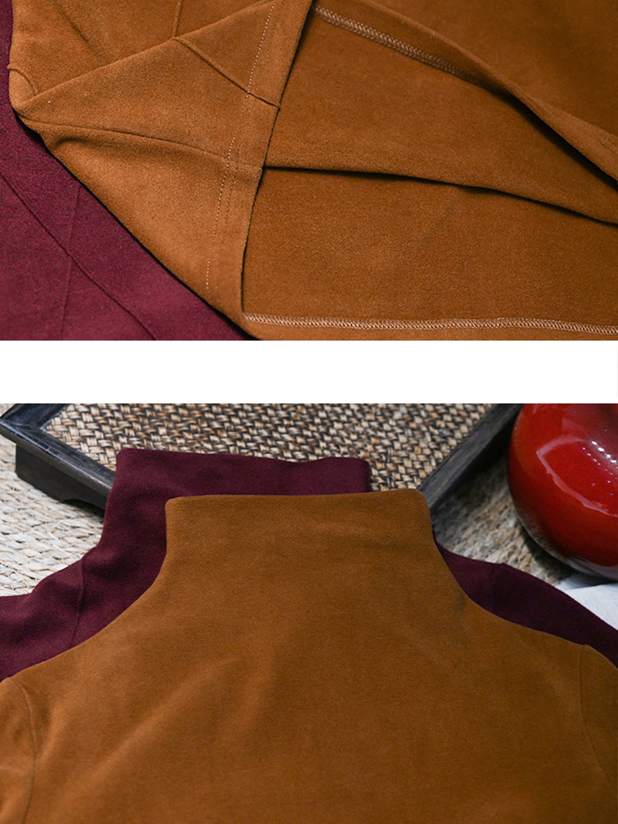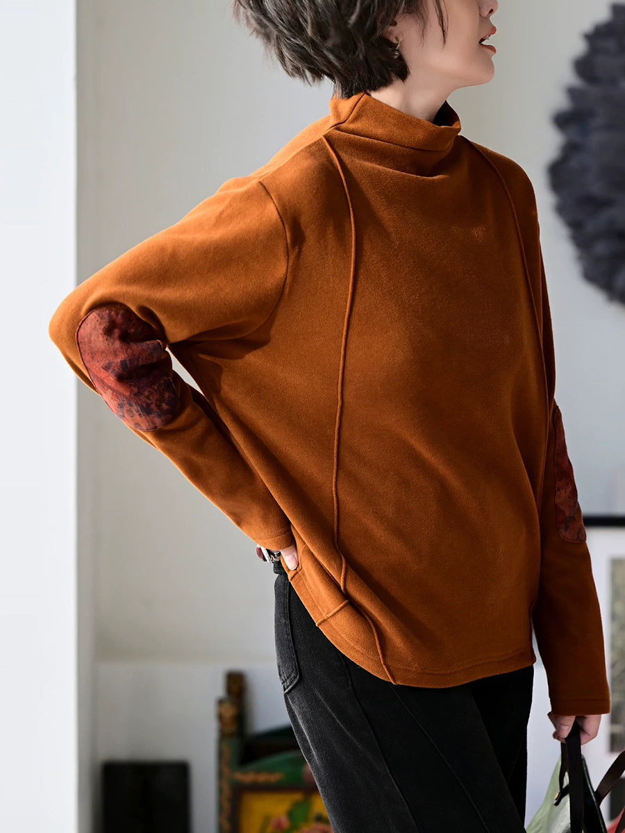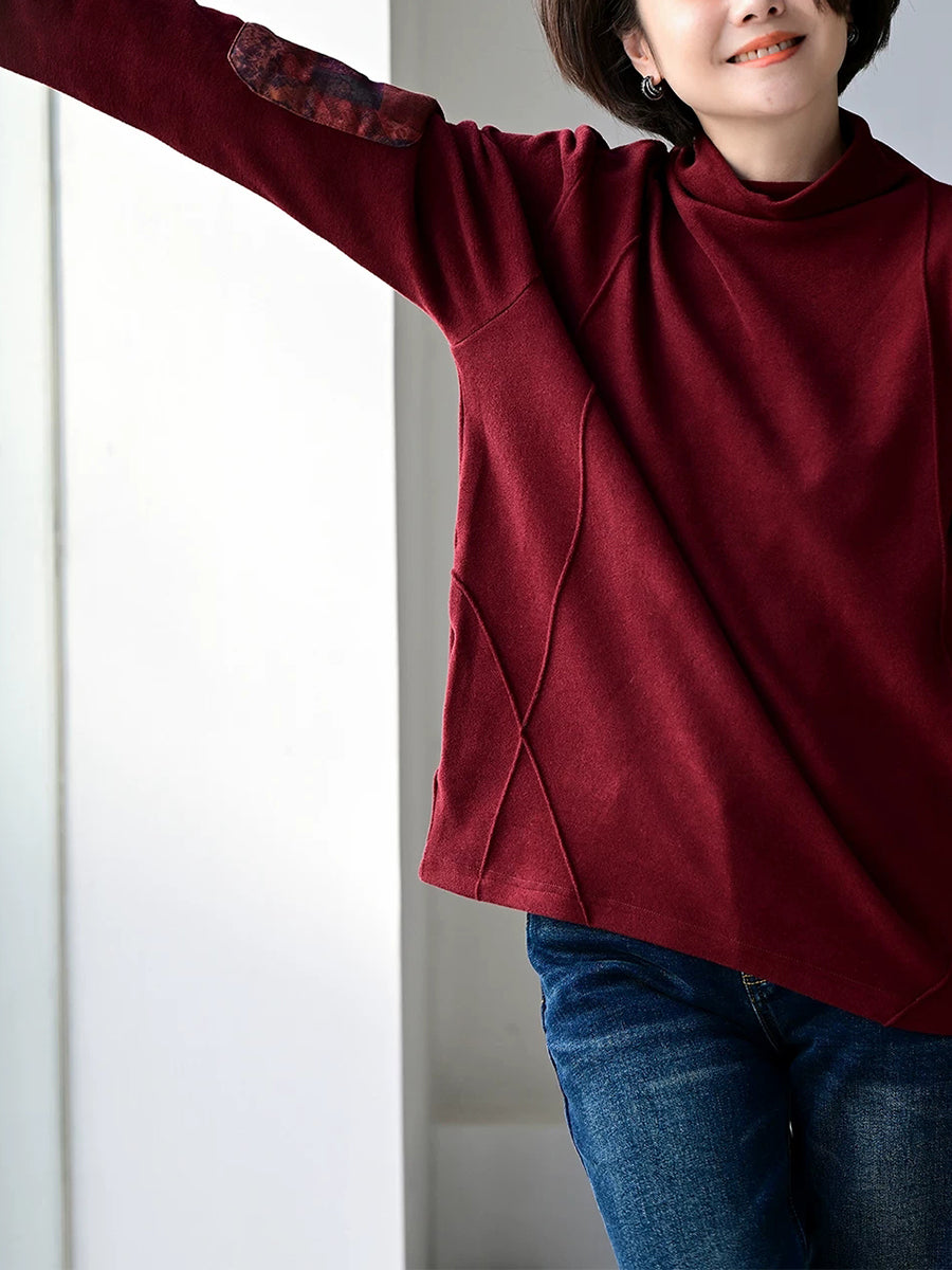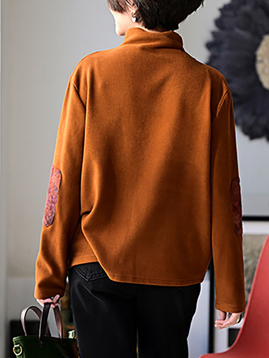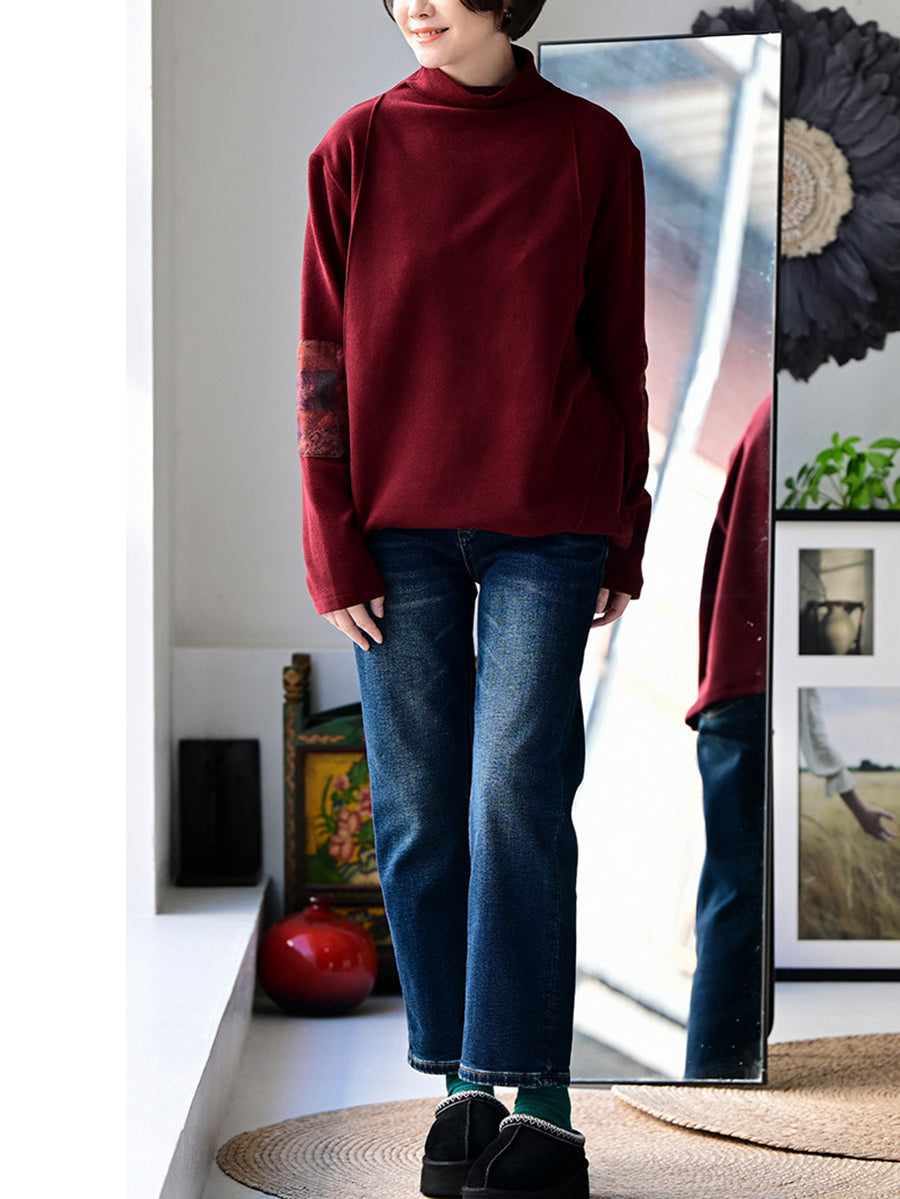 Women Spring Retro Patch Cotton Turtleneck Blouse