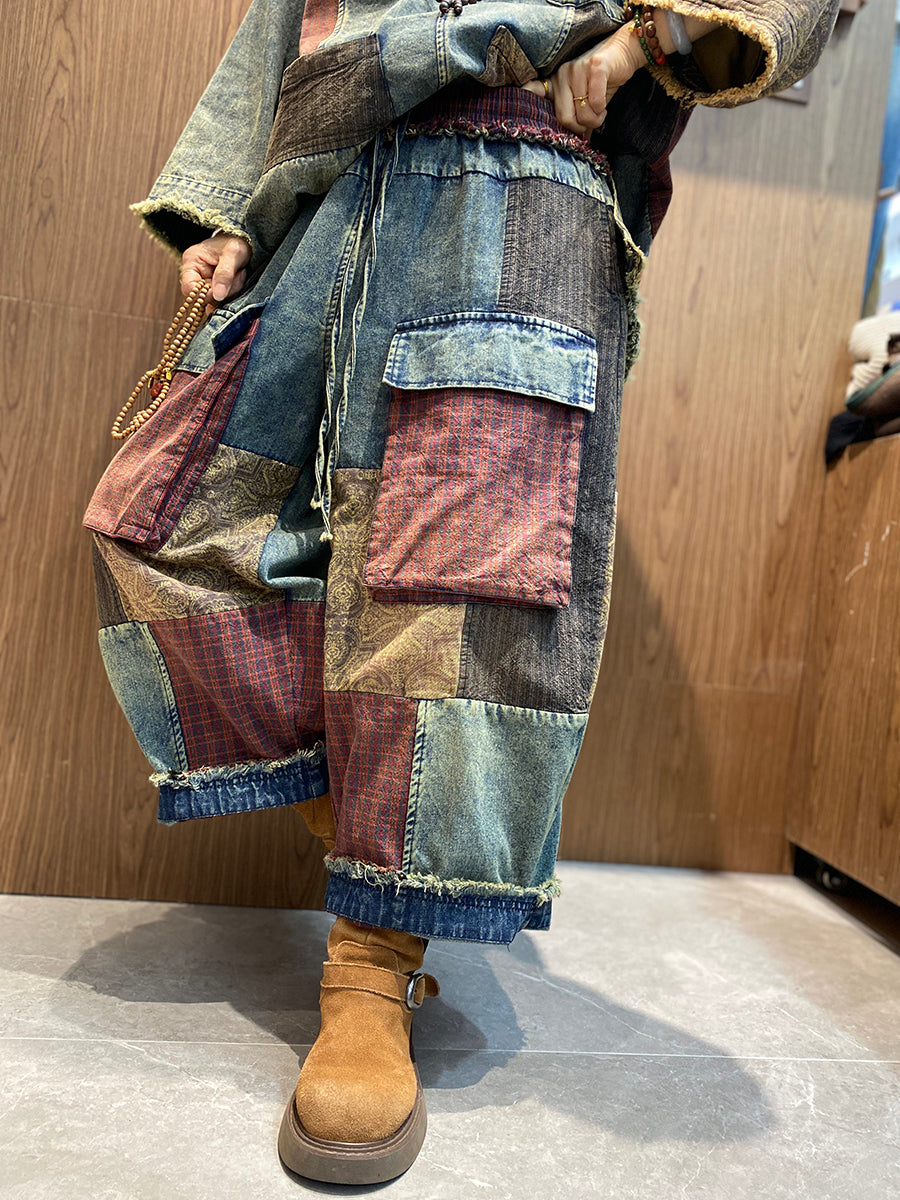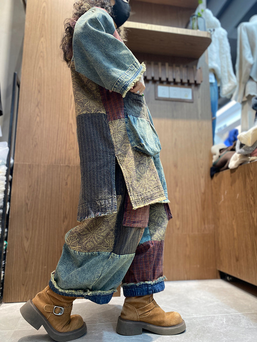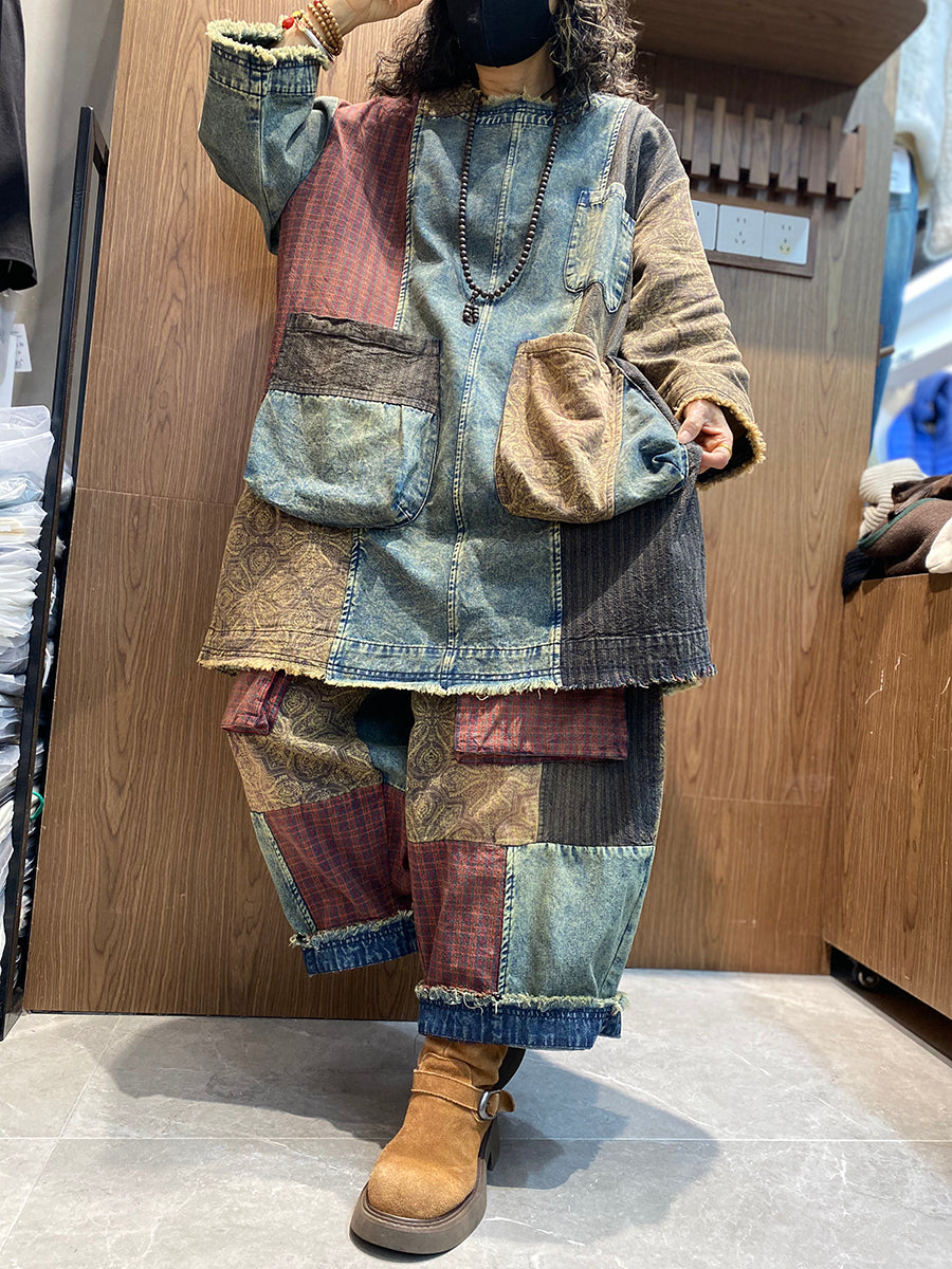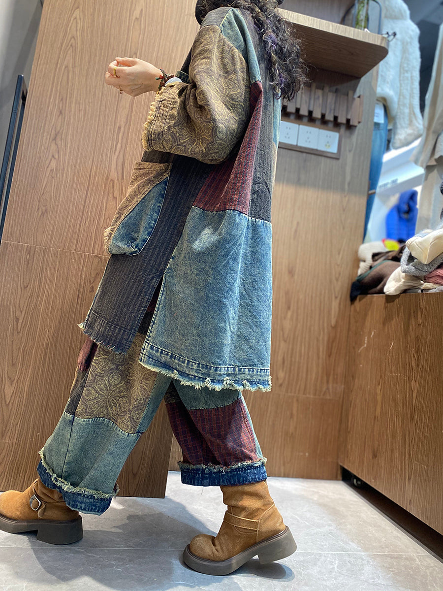 Women Spring Retro Patchwork O-Neck Padded Suits
