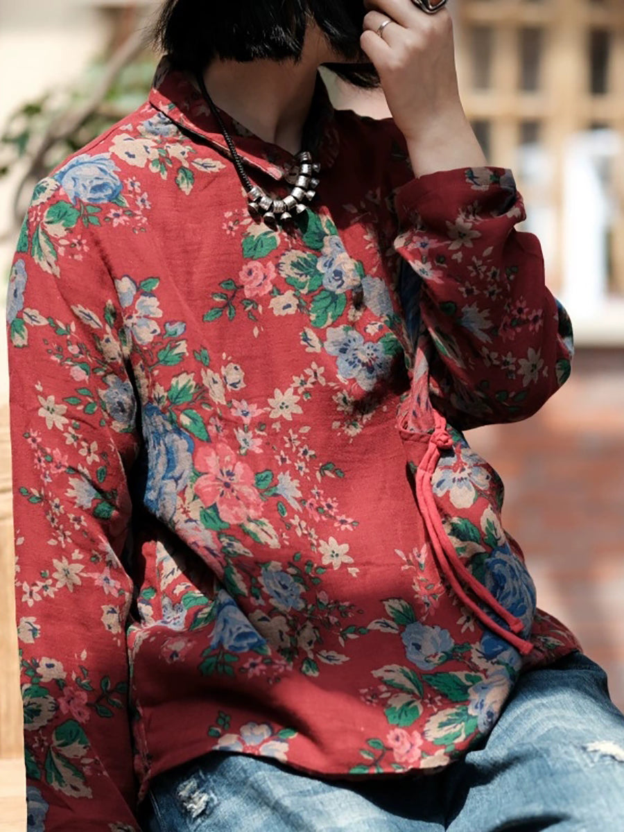 Women Spring Vintage Flower Turn-down Collar 100%Cotton Shirt