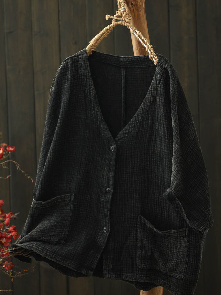 Women Summer Casual Pure Color V-Neck Cotton Shirt
