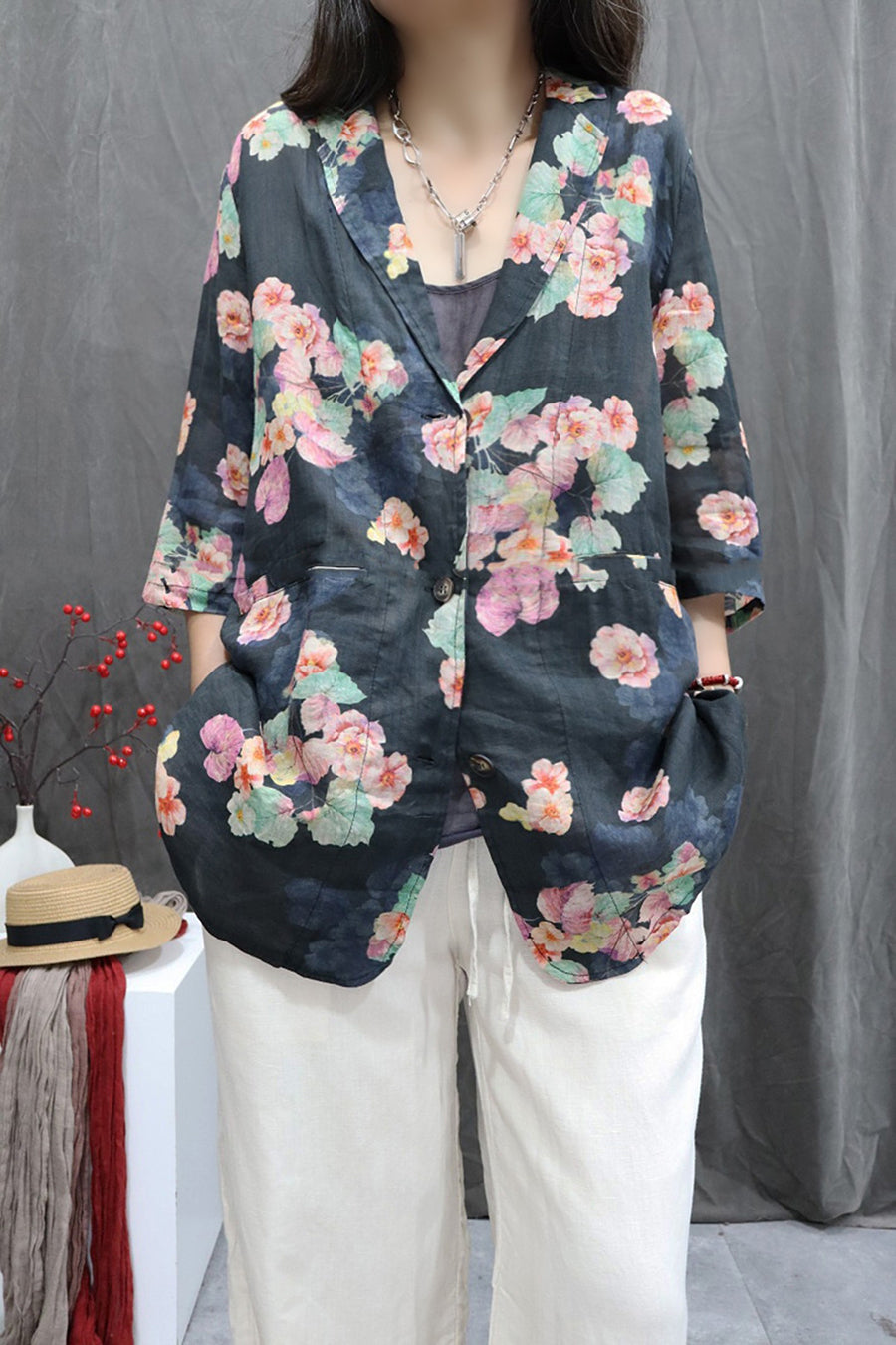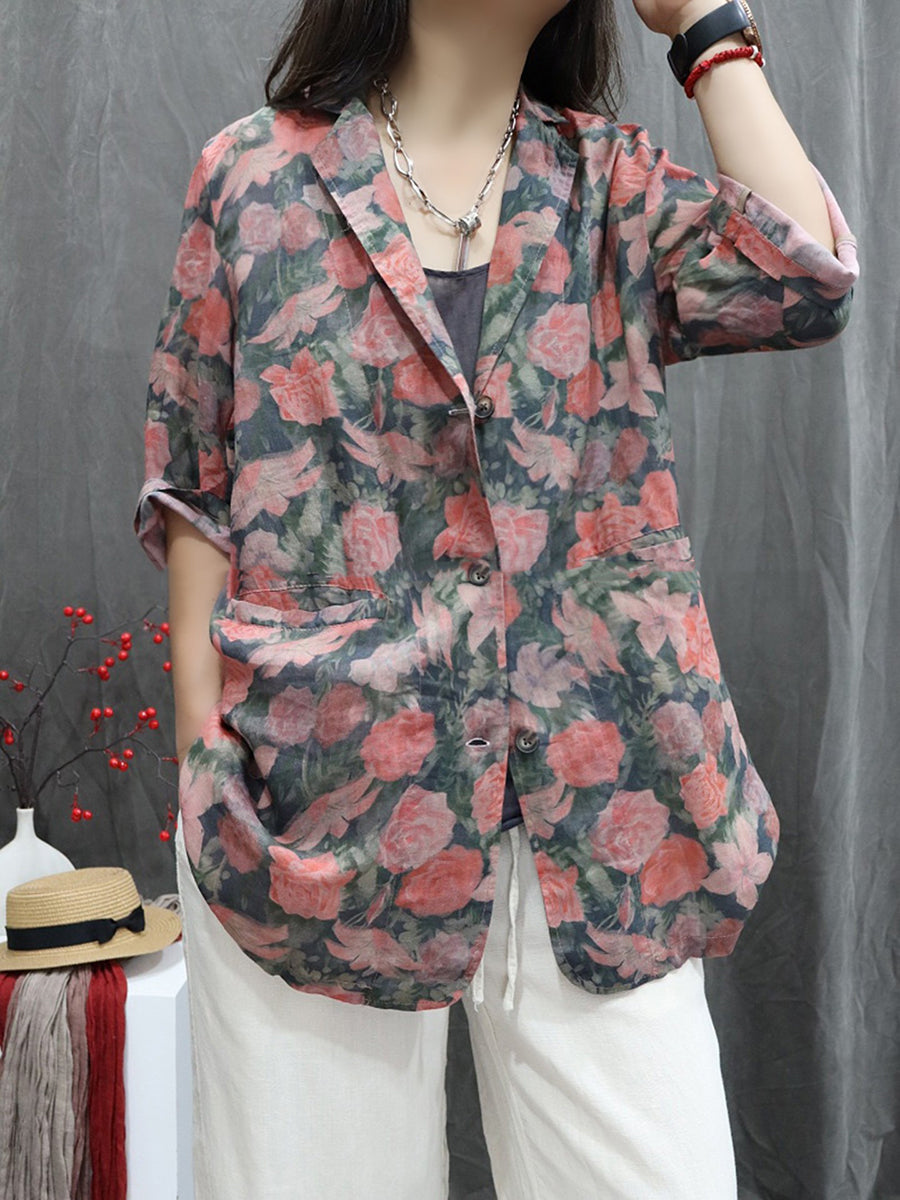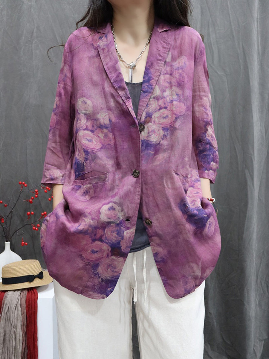 Women Summer Flower 100%Ramie Turn-down Collar Coat