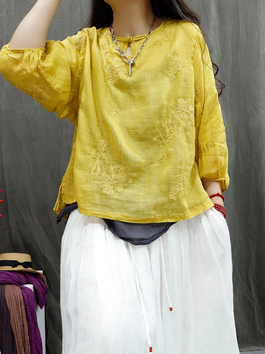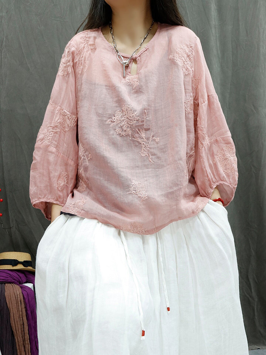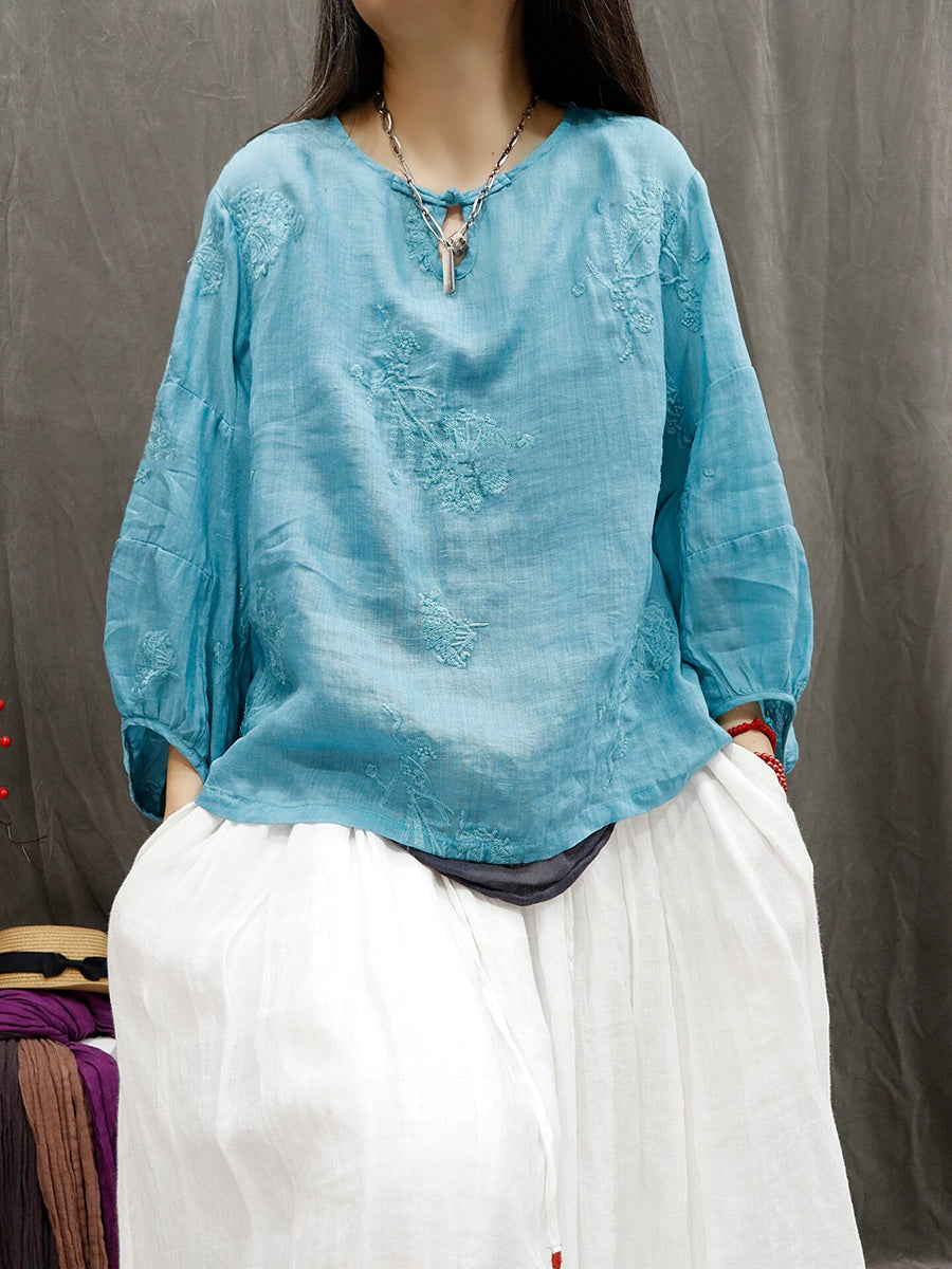 Women Summer Retro Embroidery Ramie Blouse