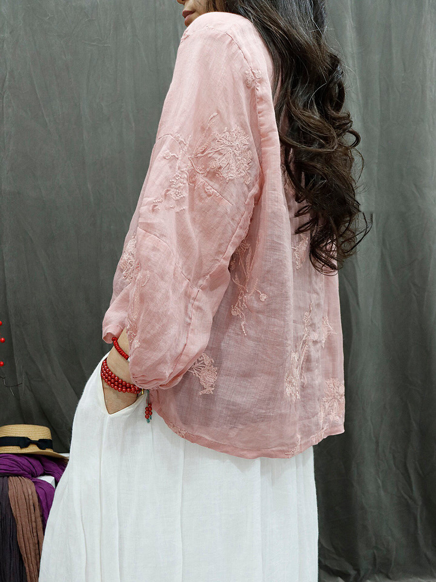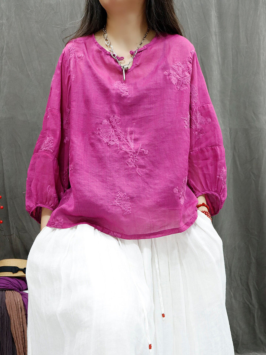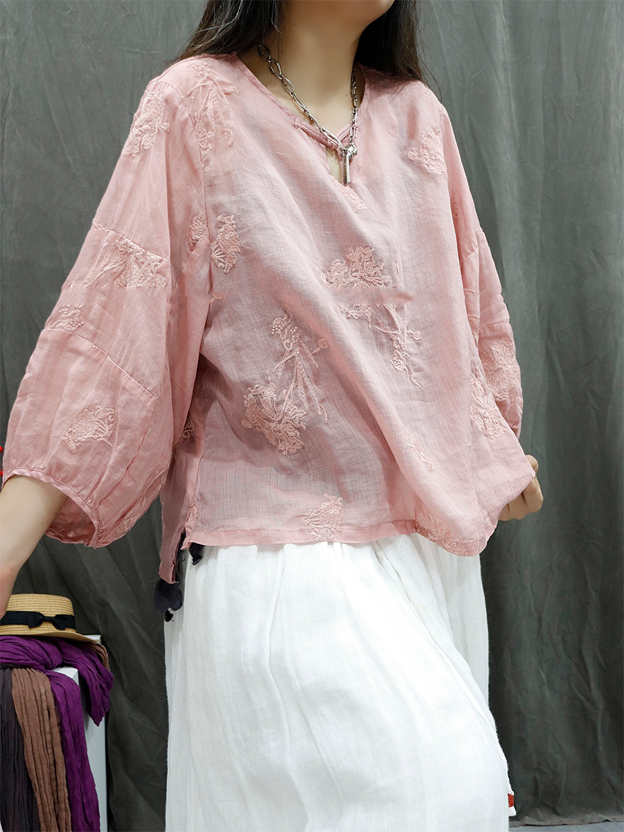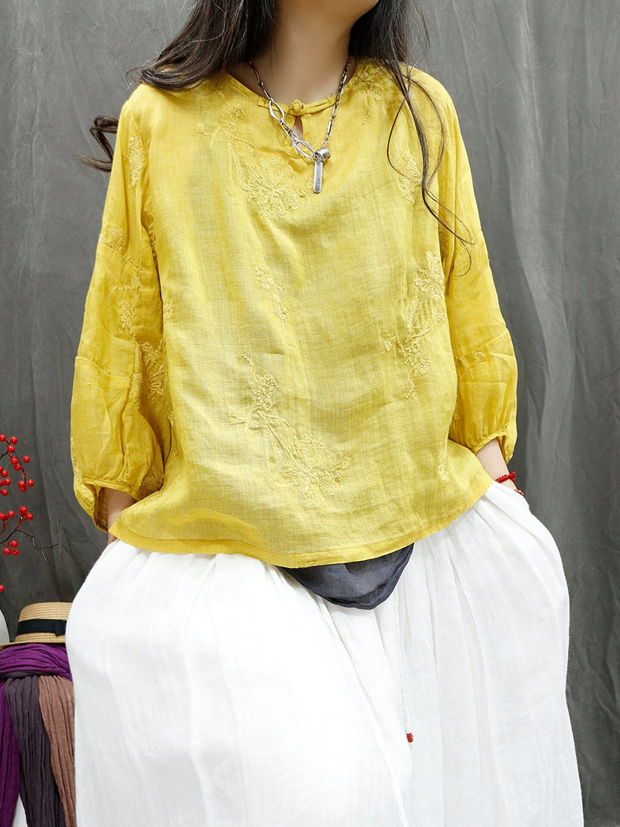 Women Summer Retro Embroidery Ramie Blouse