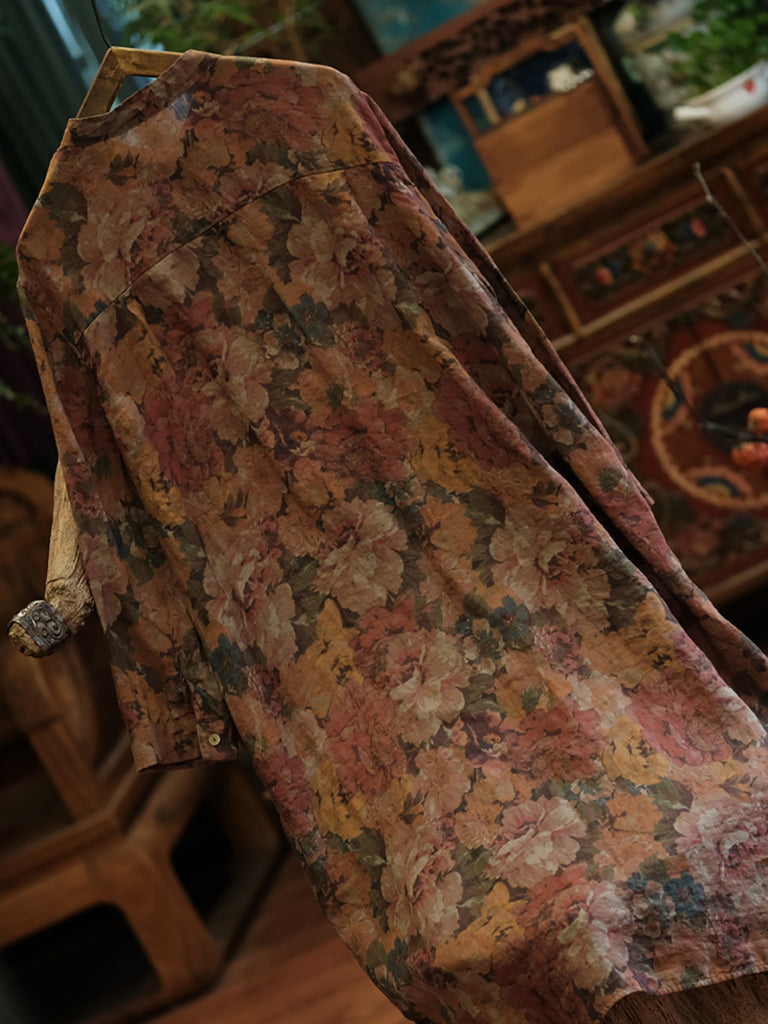Women Vintage Floral Retro Ramie Button-up Long Shirt