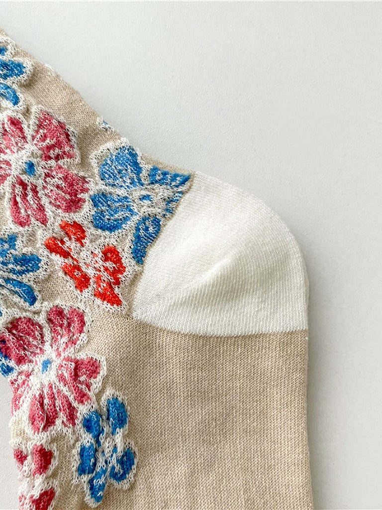 5 paires de chaussettes en coton jacquard à fleurs artistiques pour femmes