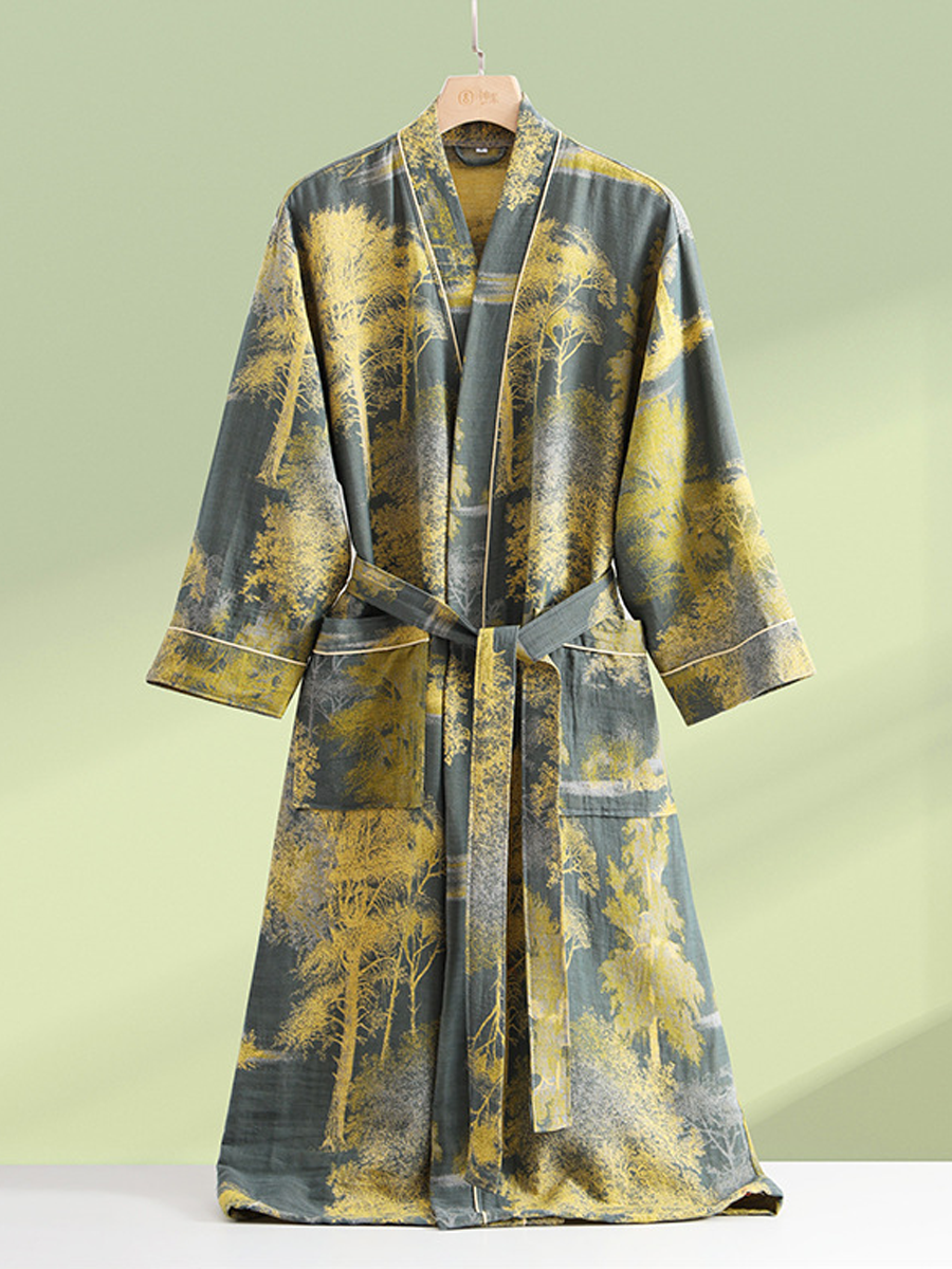 Confectionné en pur coton du Xinjiang de première qualité, ce peignoir en gaze double épaisseur est léger, respirant et très absorbant. Sa coupe ample et son tissu doux et confortable offrent une sensation de bien-être et de détente. Orné d'un élégant motif floral, de larges poignets, de manches longues et d'une ceinture raffinée, ce peignoir allie avec brio simplicité et sophistication.