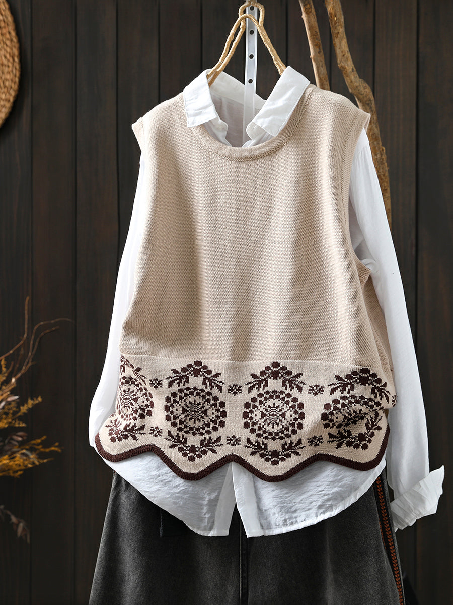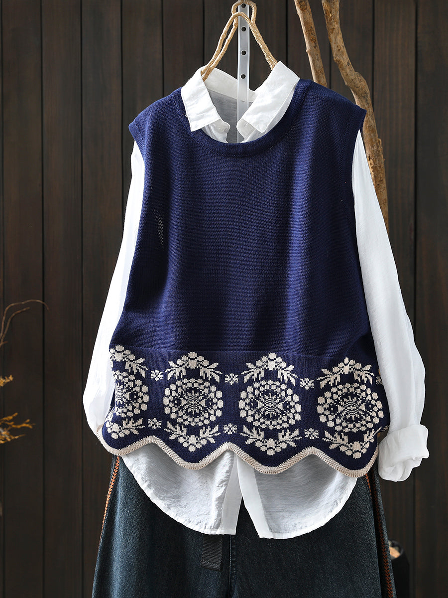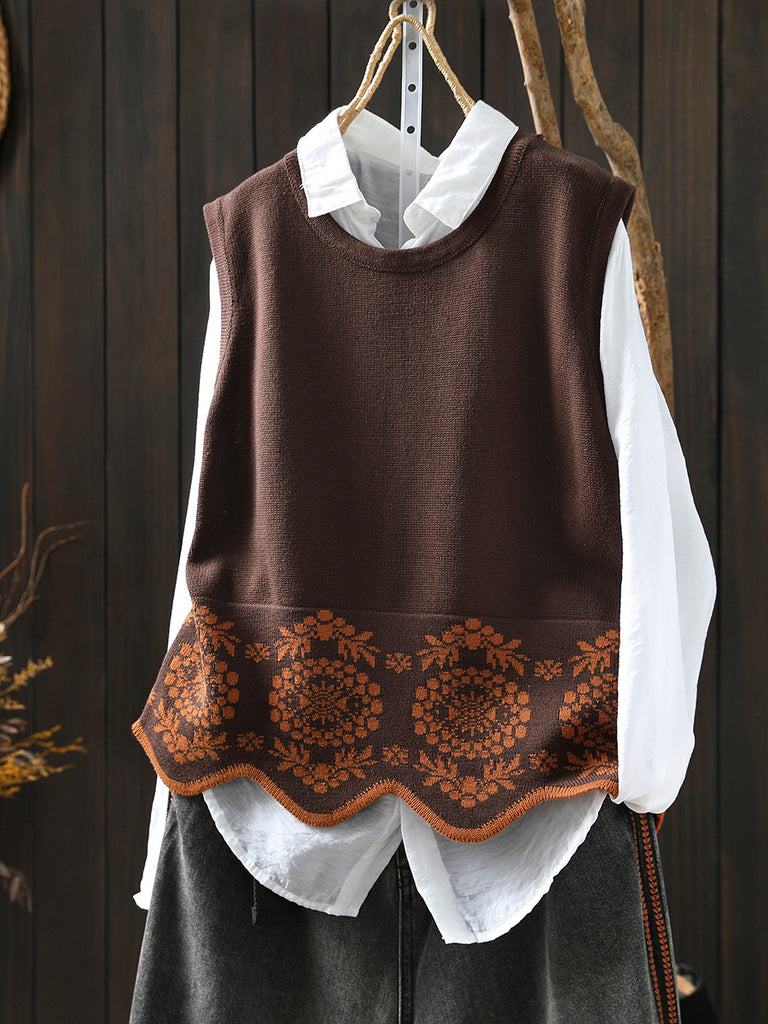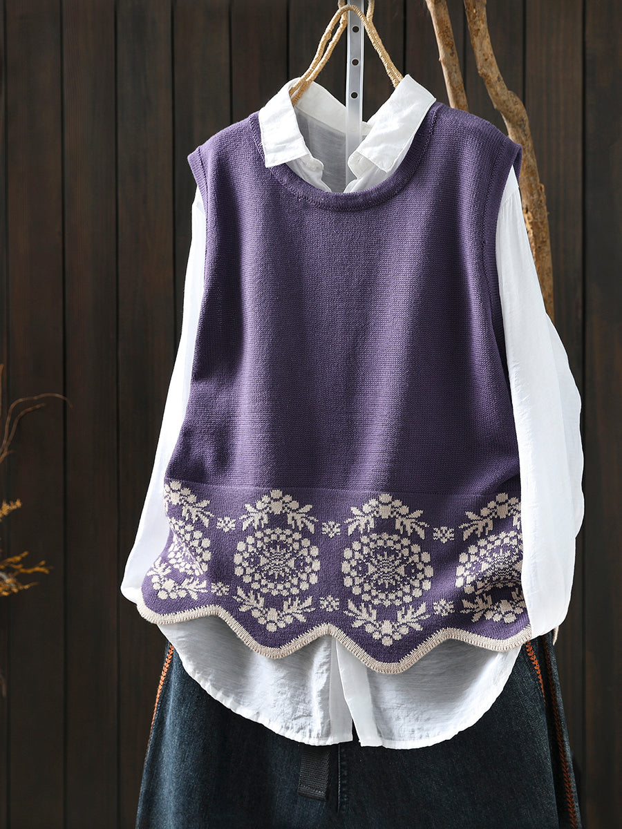 Gilet tricoté à col rond et ourlet ondulé à fleurs artistiques pour femme