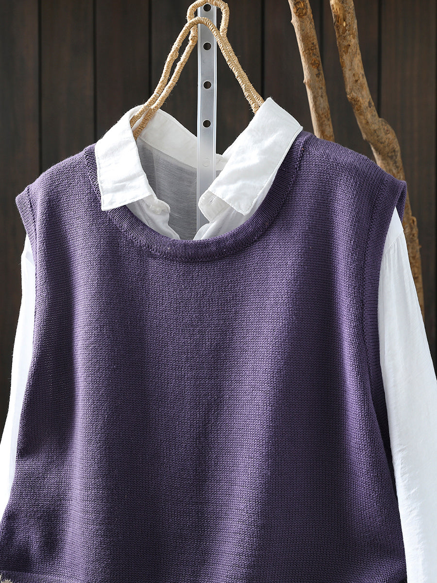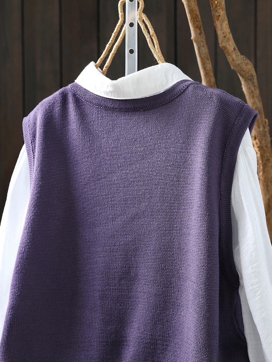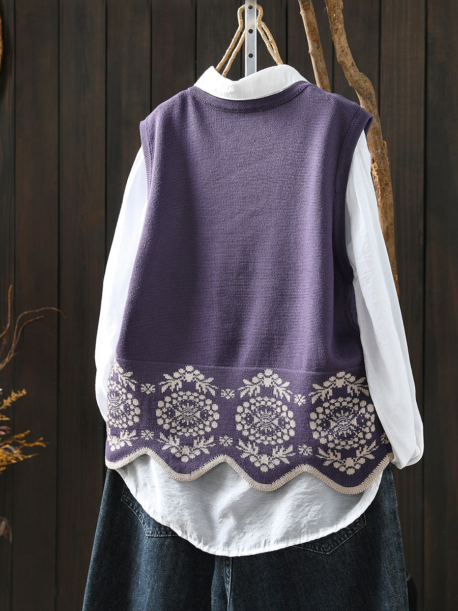 Gilet tricoté à col rond et ourlet ondulé à fleurs artistiques pour femme