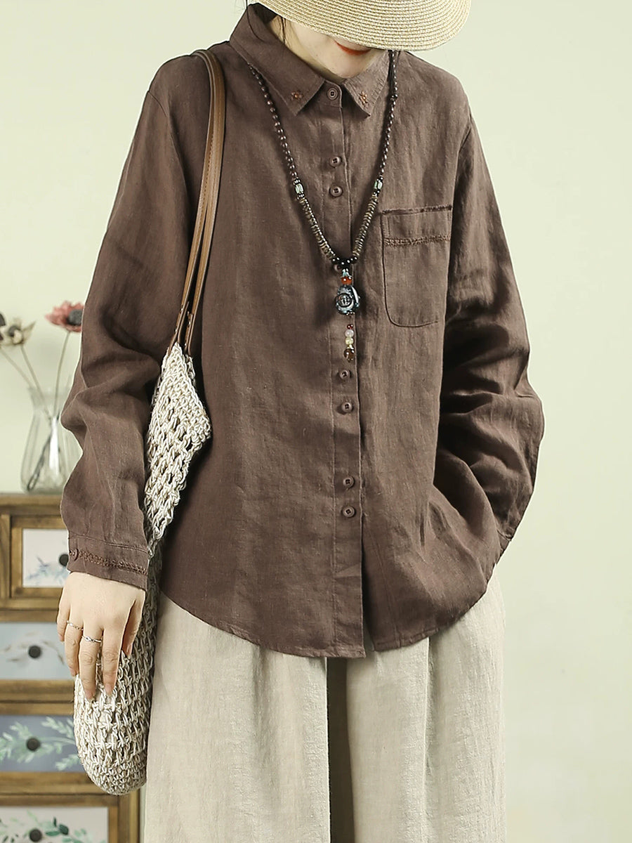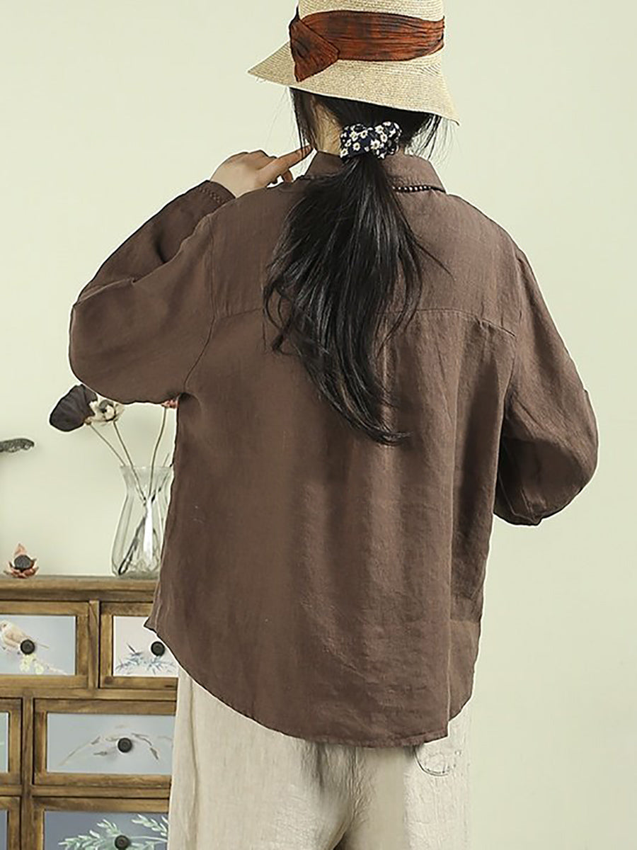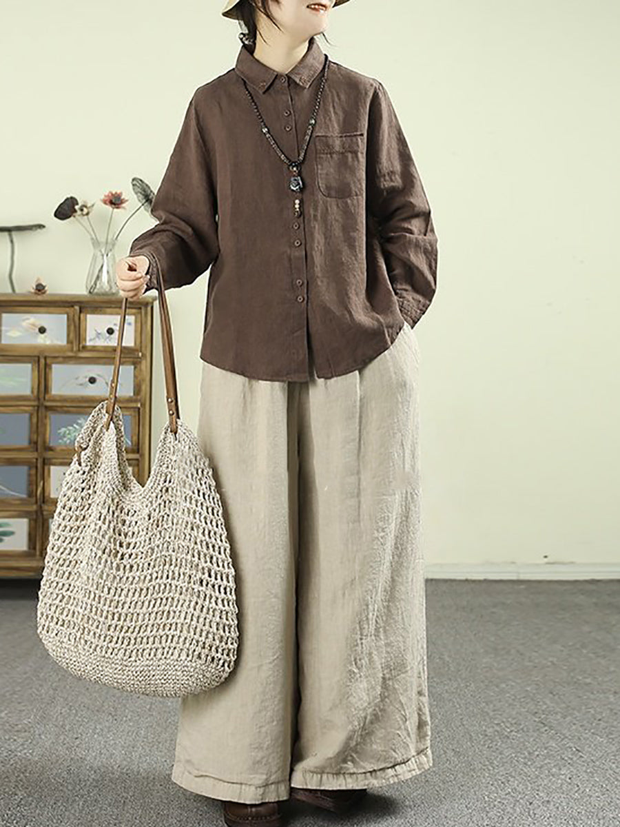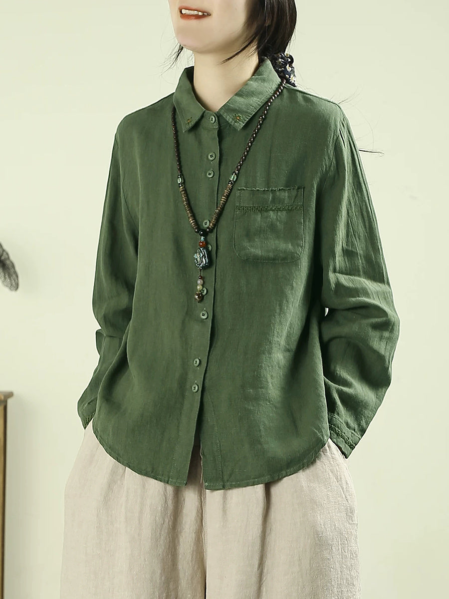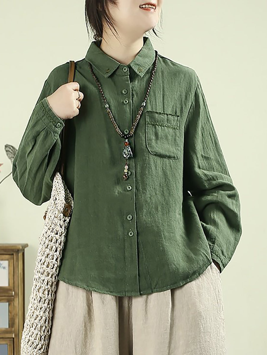 Chemise à col rabattu 100% lin, style artistique printanier, couleur unie