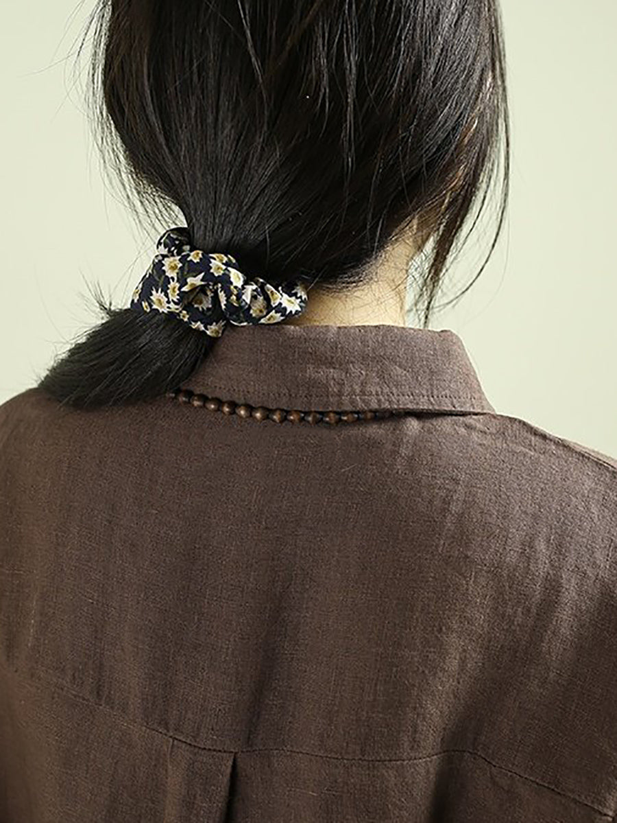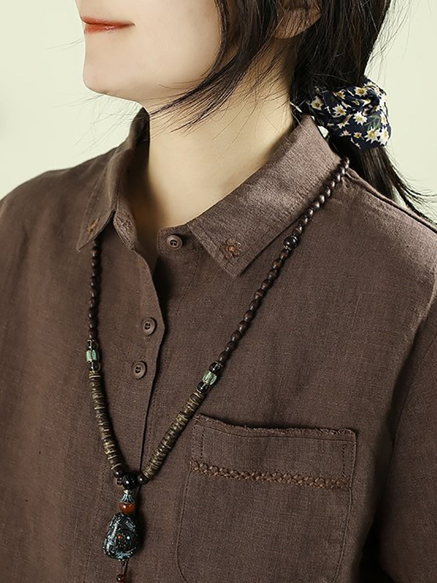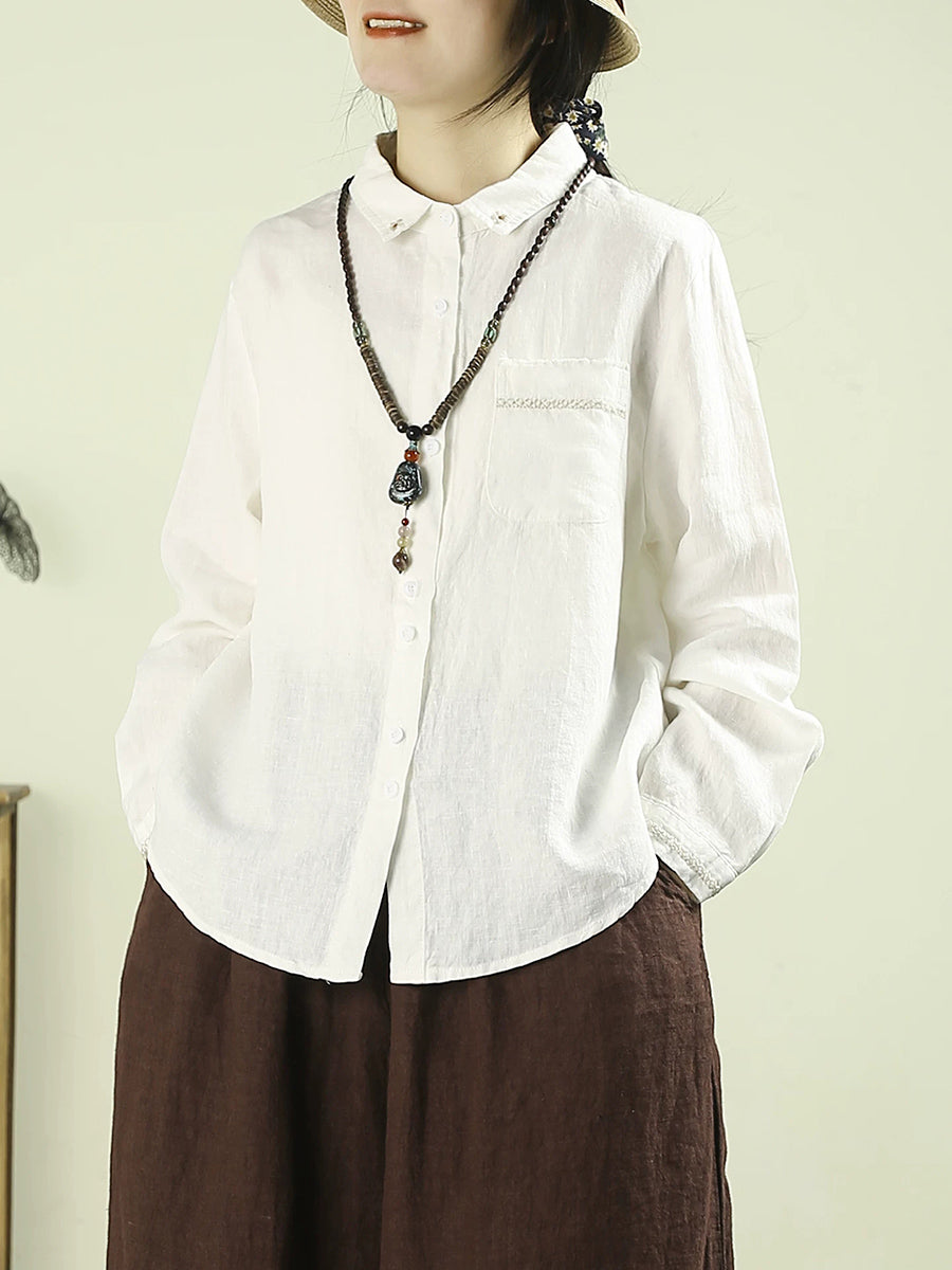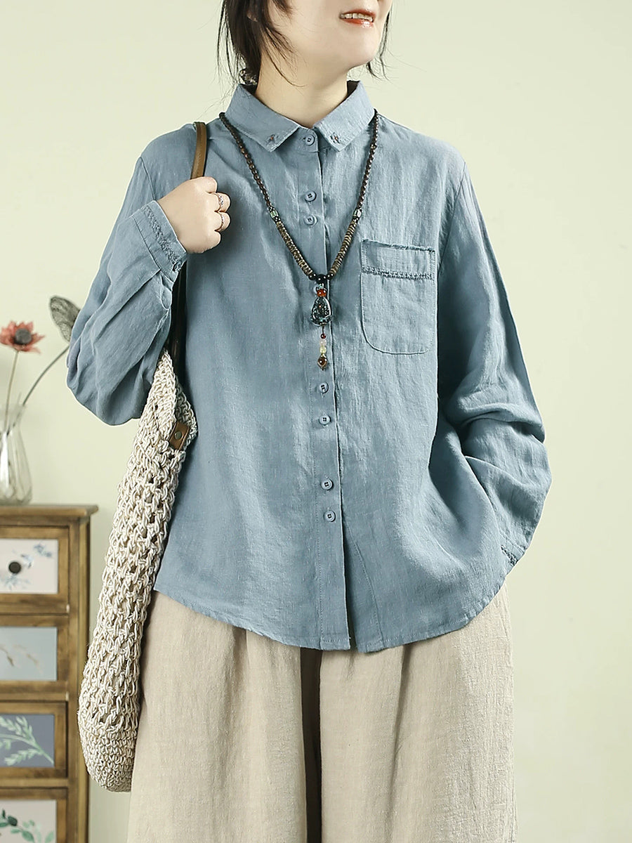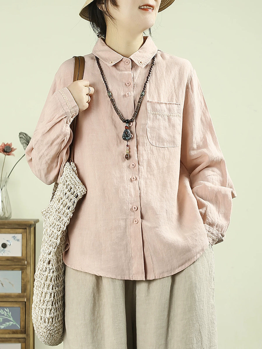 Chemise à col rabattu 100% lin, style artistique printanier, couleur unie