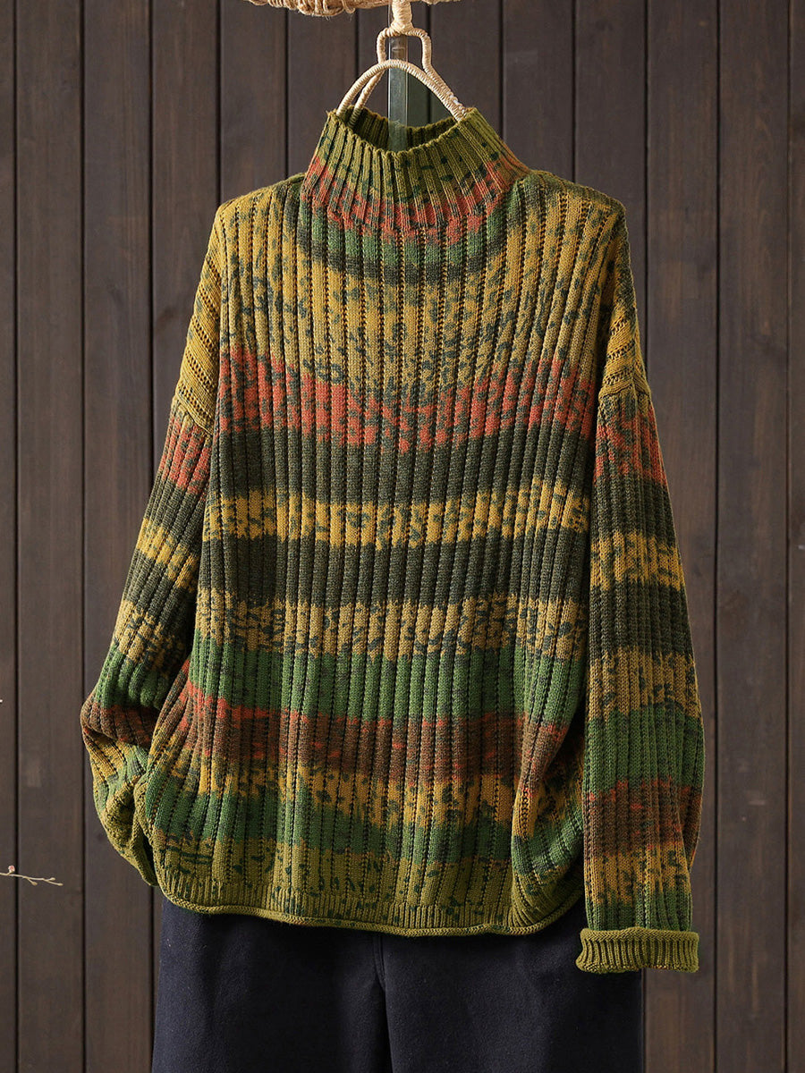 Orné d'un motif rayé, ce pull possède un col roulé mi-long et des manches raglan au design vintage. Idéal pour le printemps et l'automne, il allie style classique et confort saisonnier.