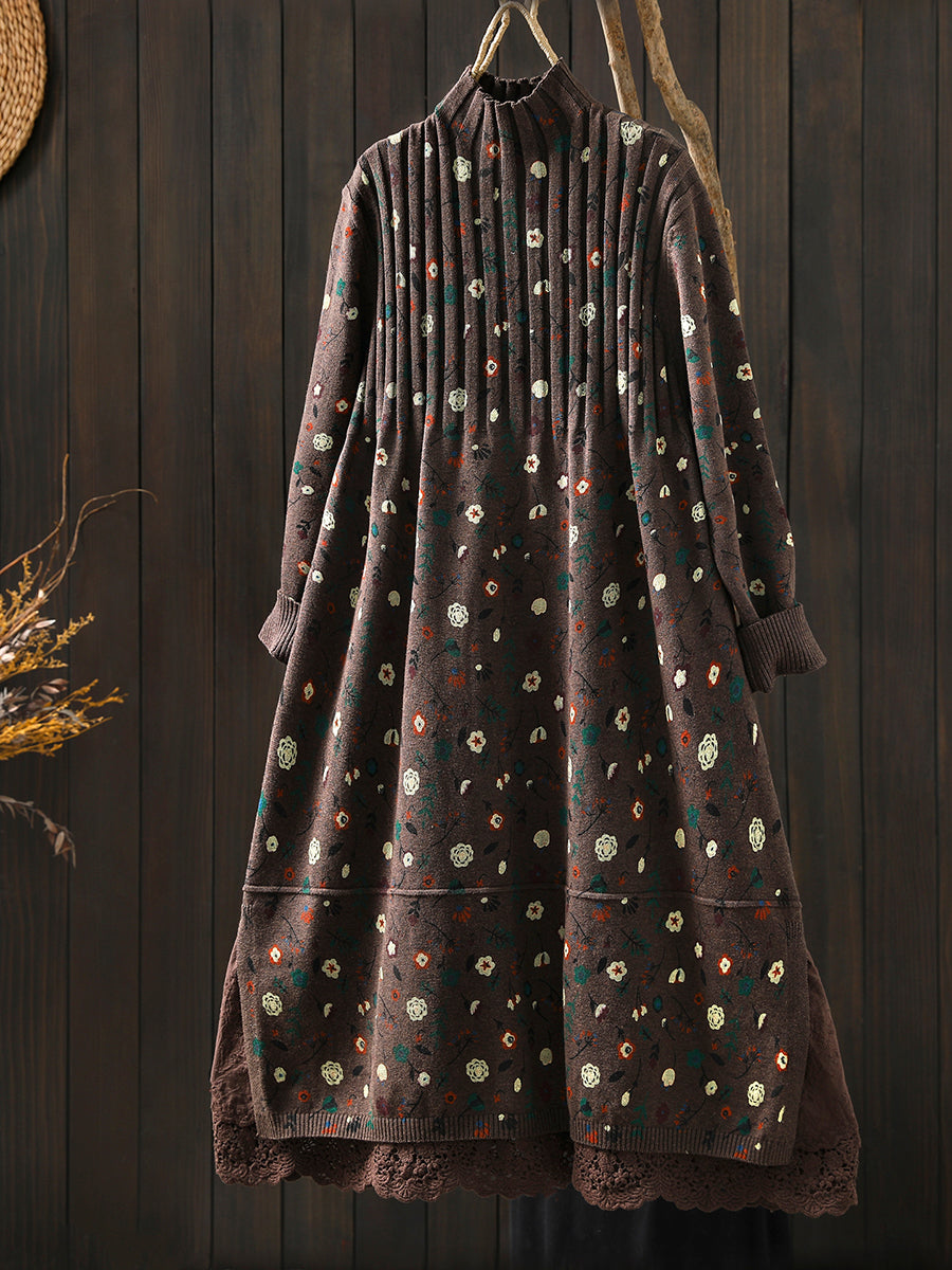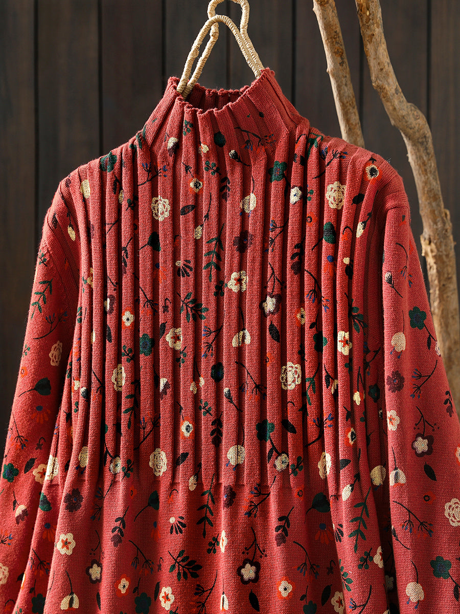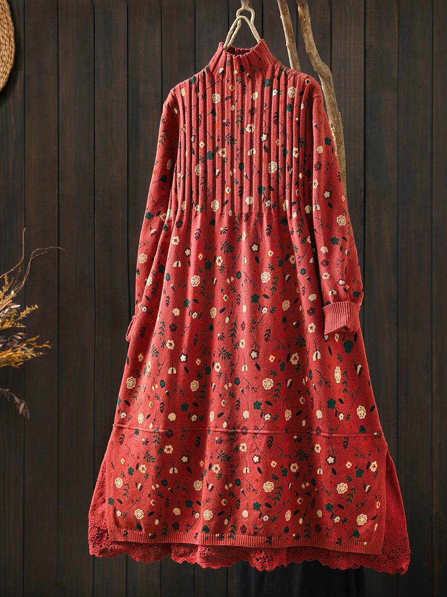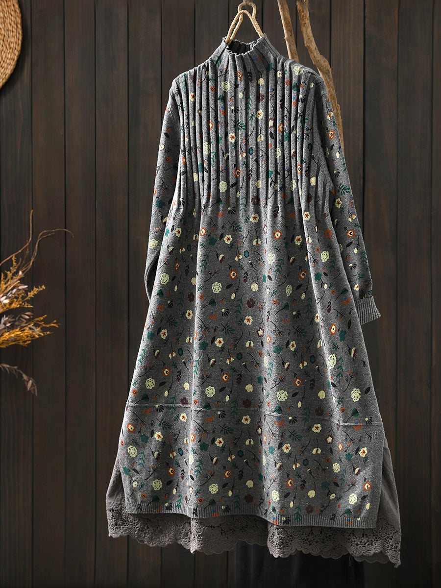 Robe en maille à col roulé fleuri vintage automne pour femme