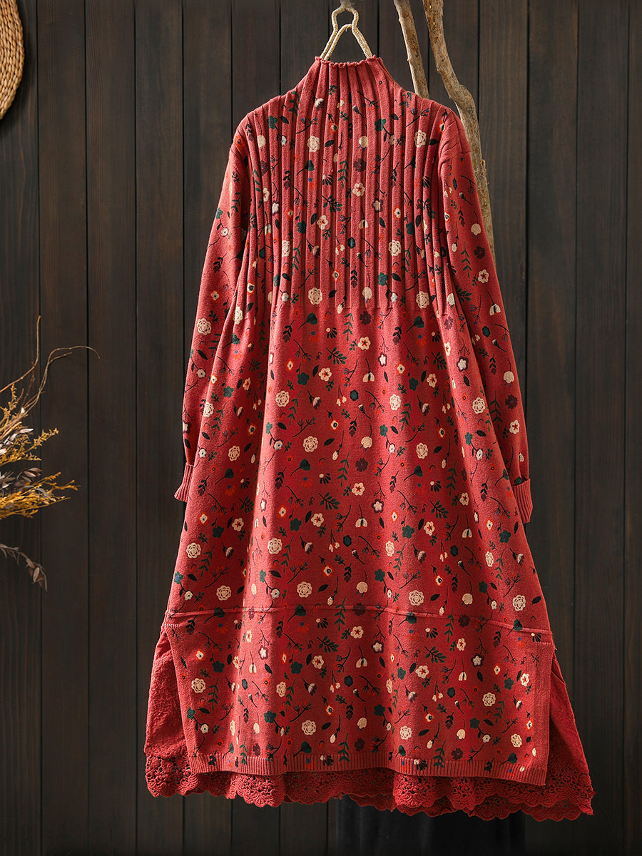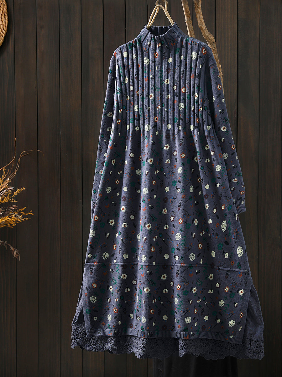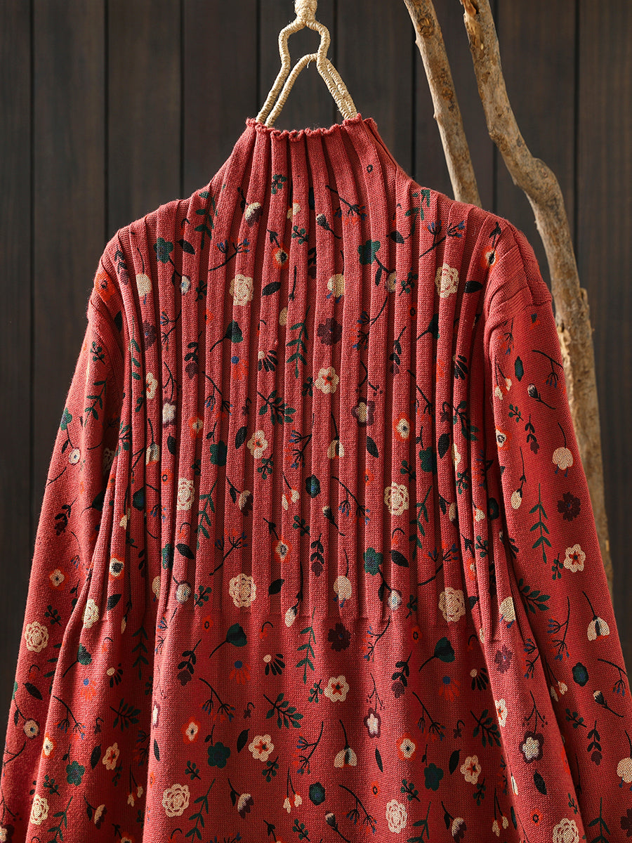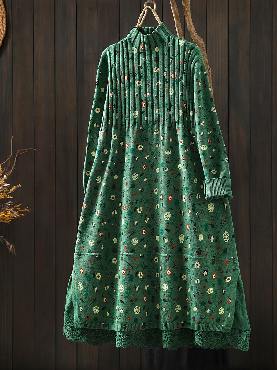 Robe en maille à col roulé fleuri vintage automne pour femme