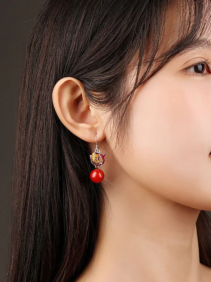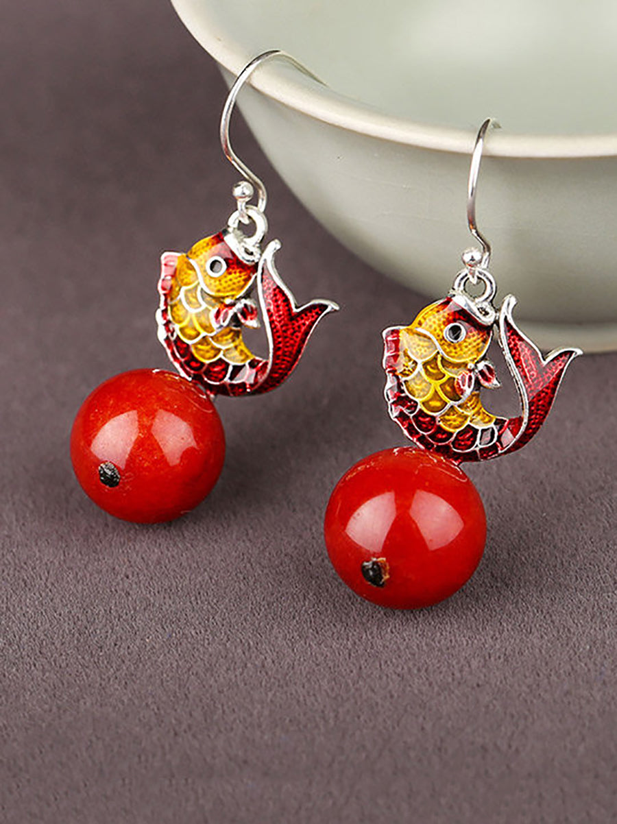 Boucles d'oreilles ethniques cloisonnées en forme de poisson avec perles rouges pour femmes
