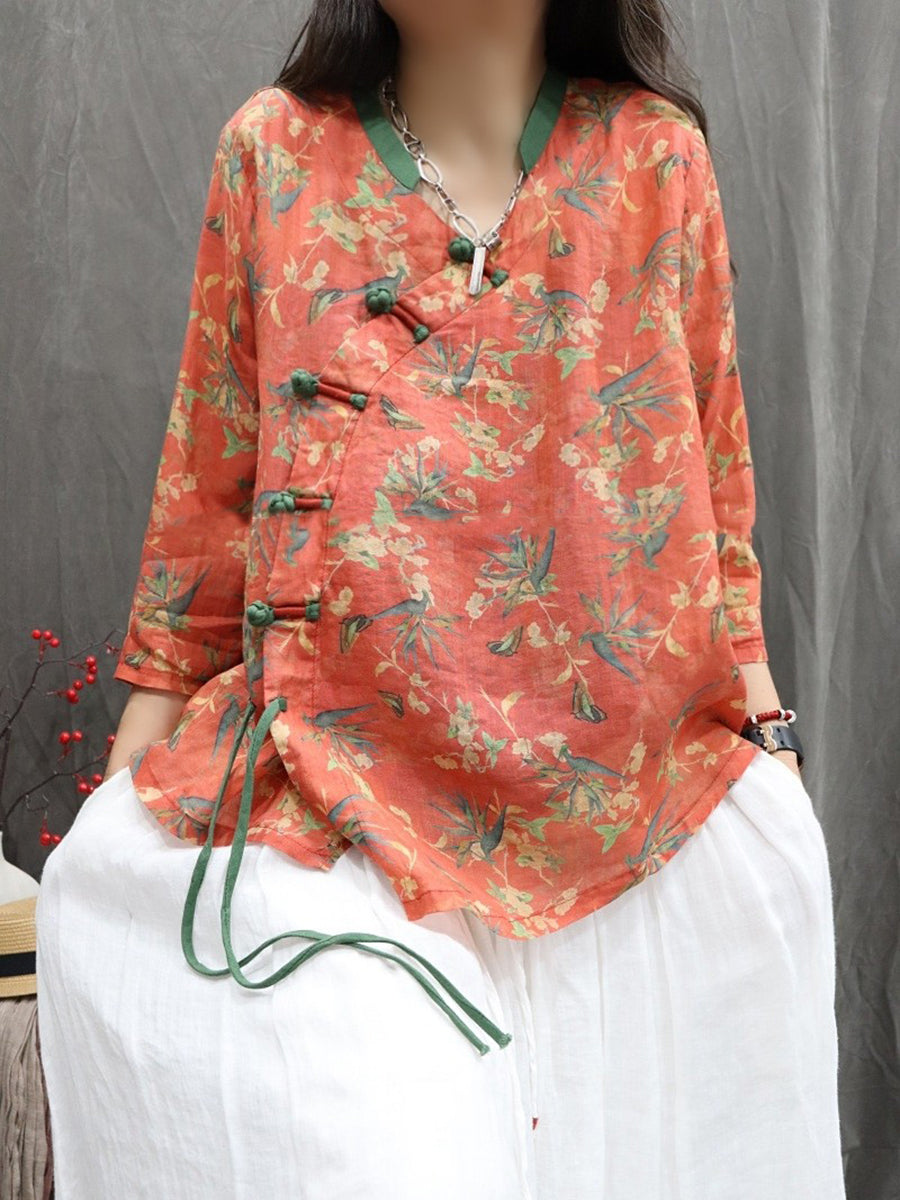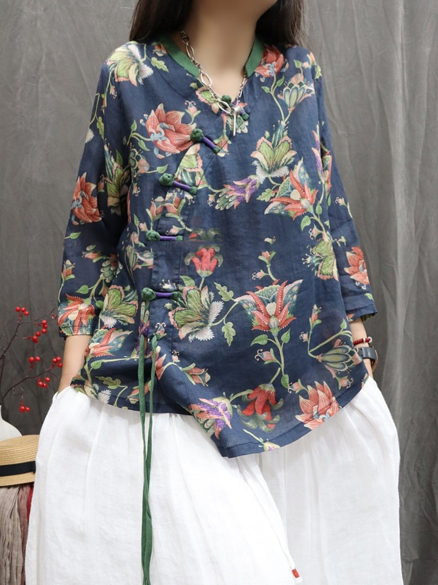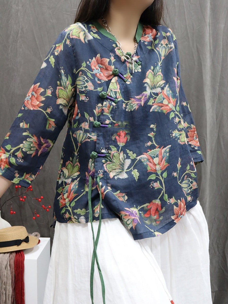 Chemise ethnique printanière à fleurs pour femme, col en V, 100 % rapie