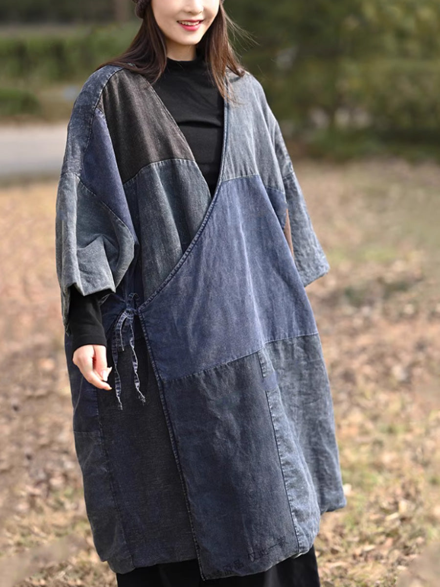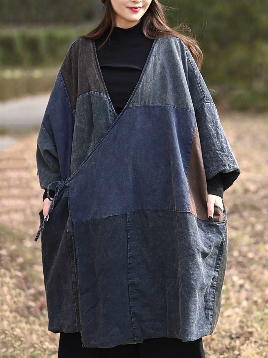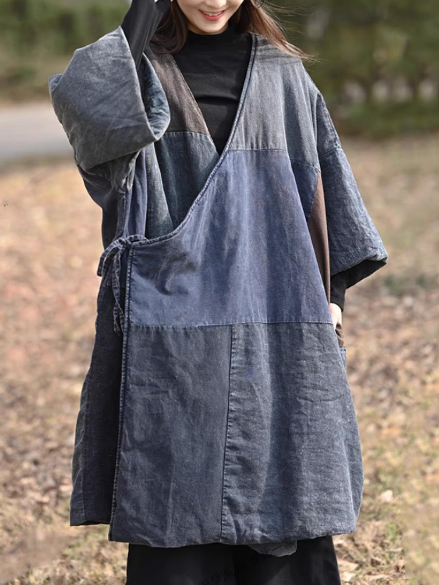Manteau matelassé rétro en coton à empiècements colorés et col en V pour femme