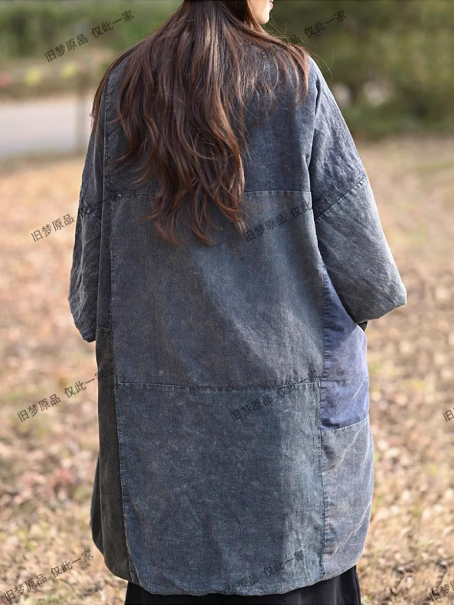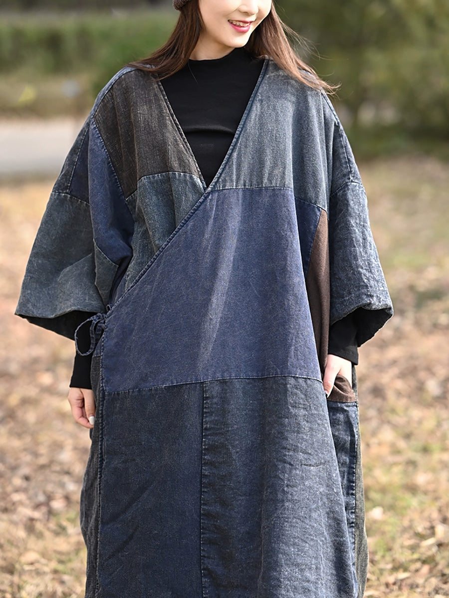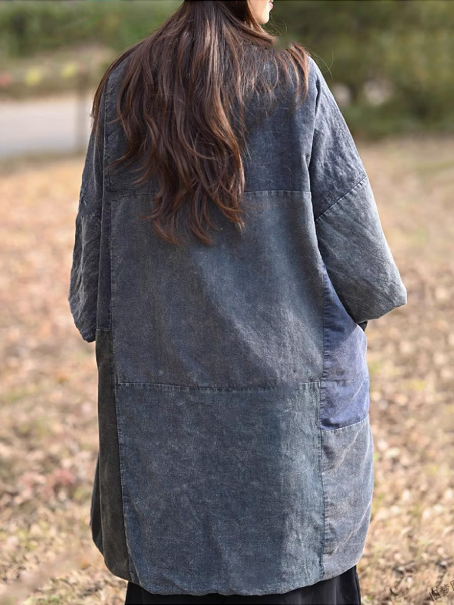 Manteau matelassé rétro en coton à empiècements colorés et col en V pour femme