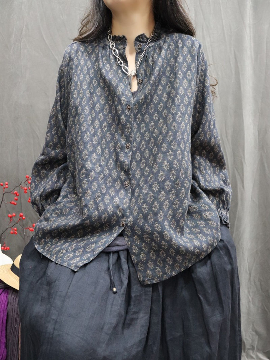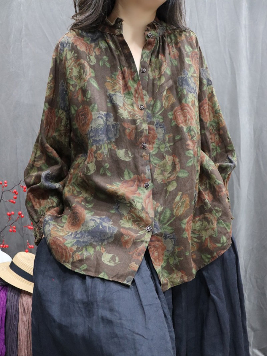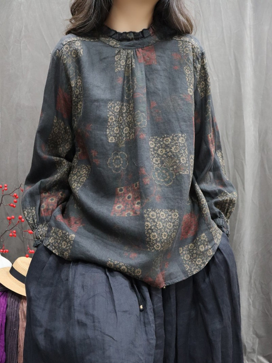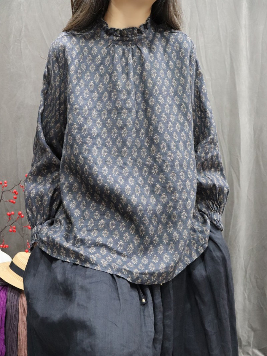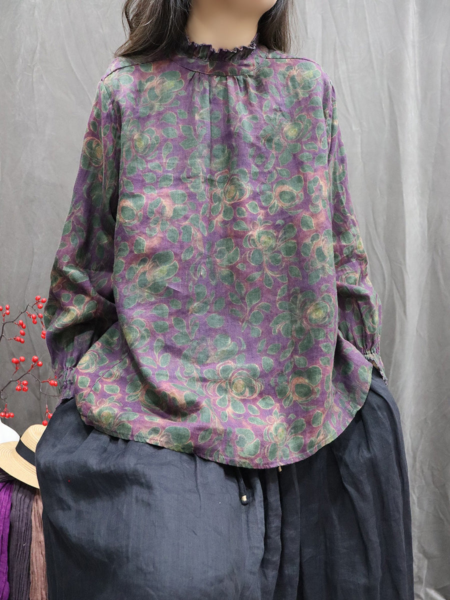 Chemise printanière pour femme, col montant, imprimé floral artistique, 100 % lin