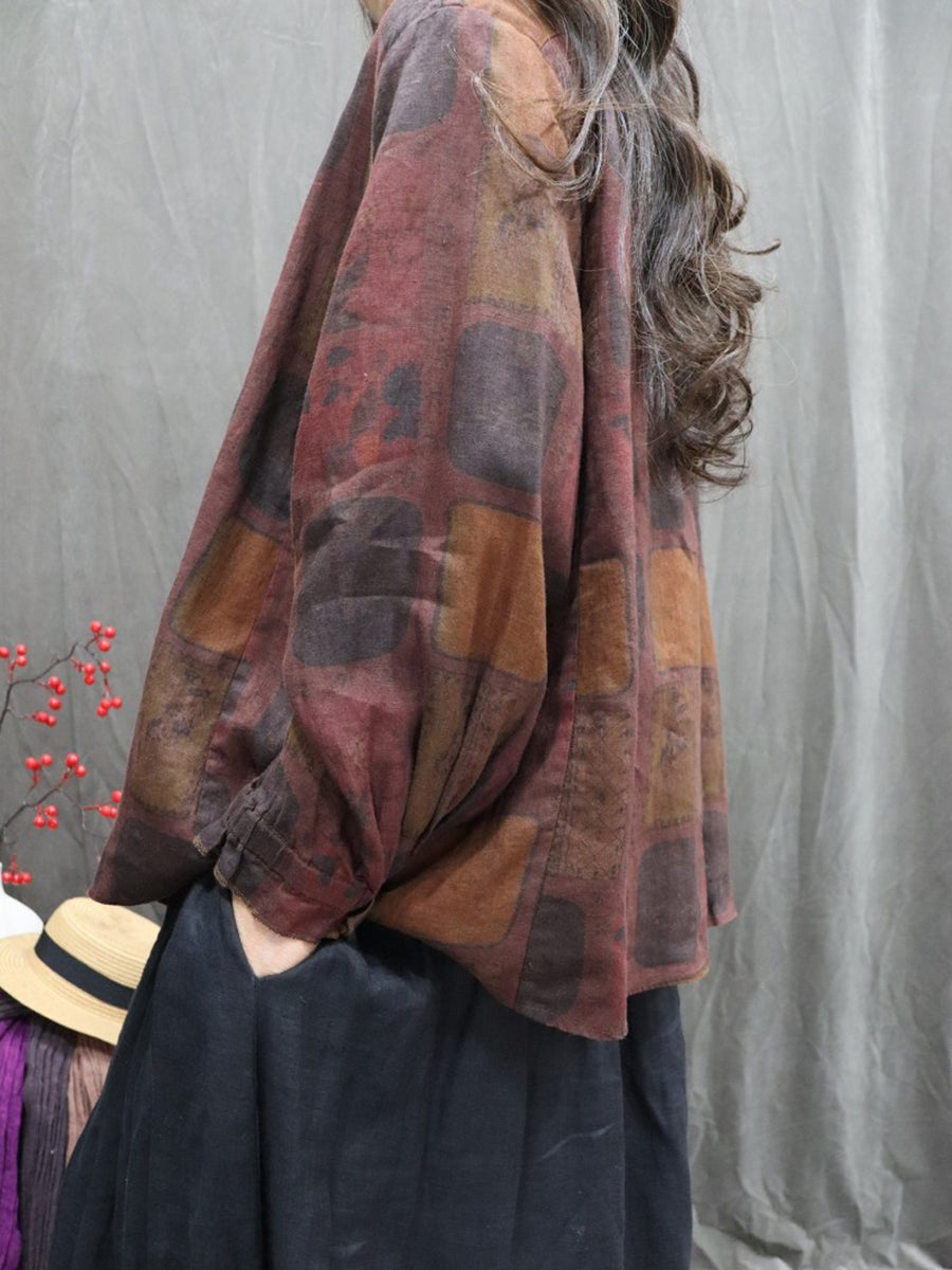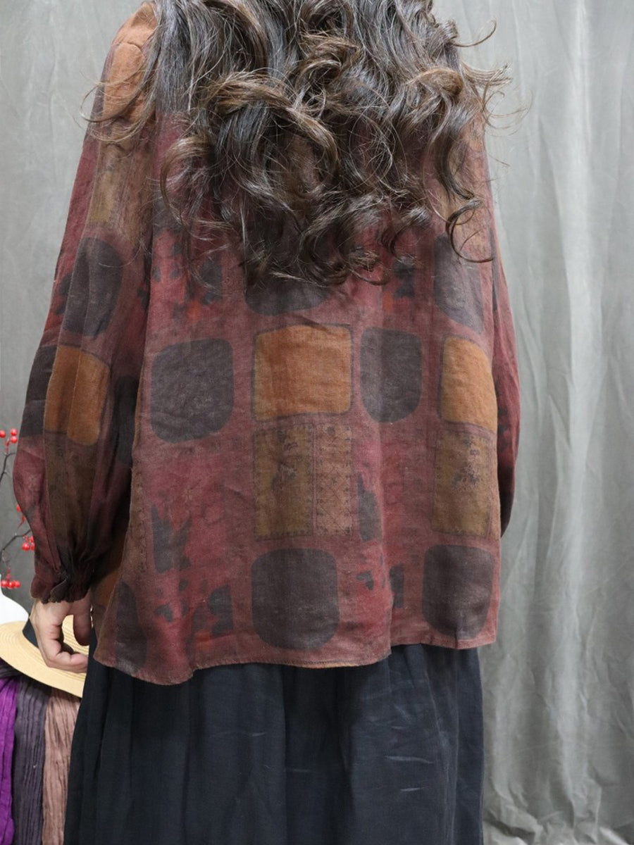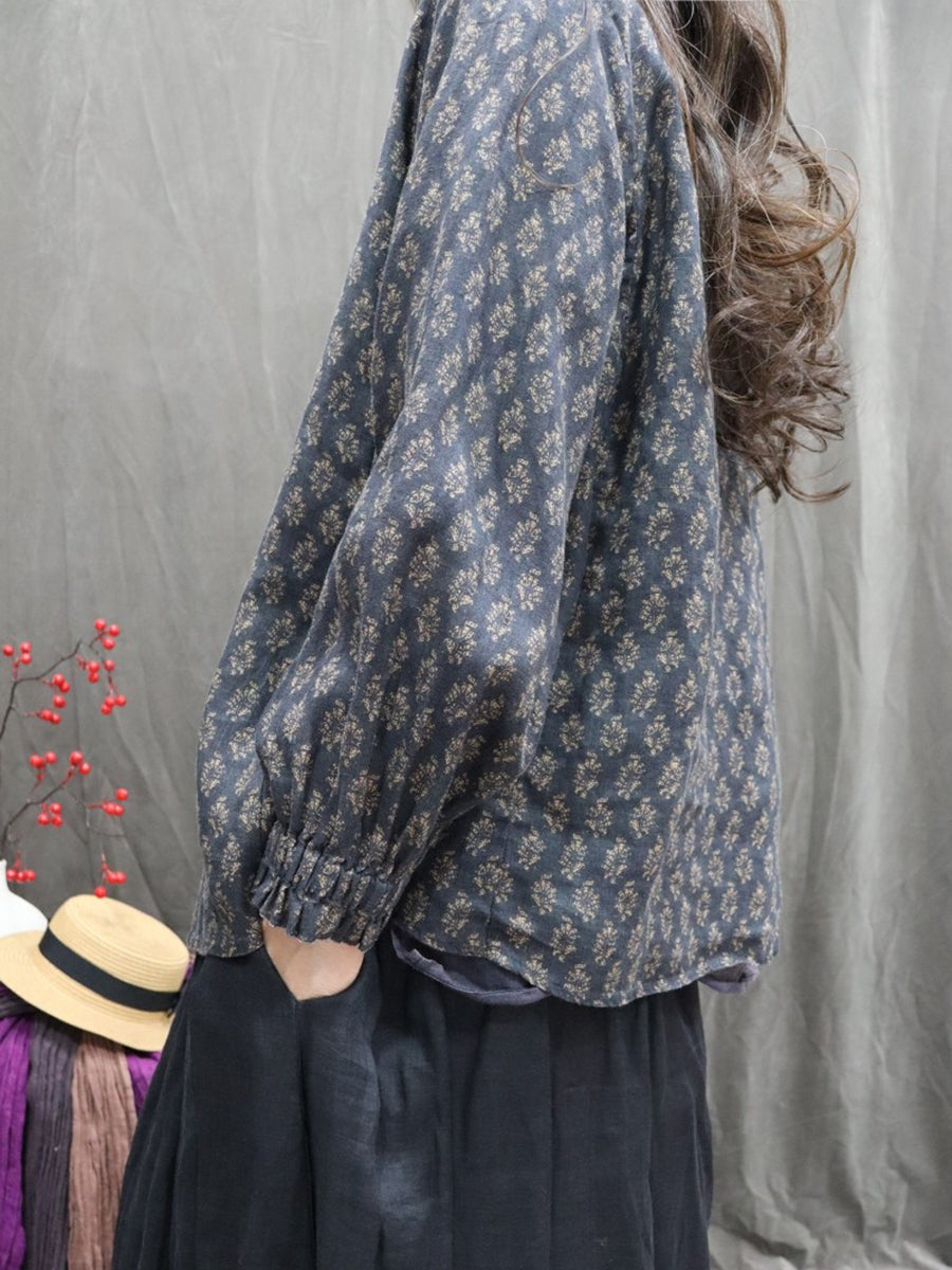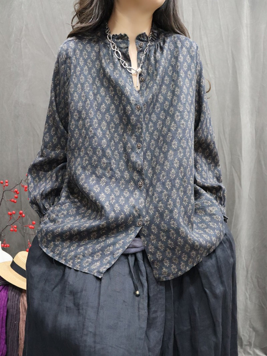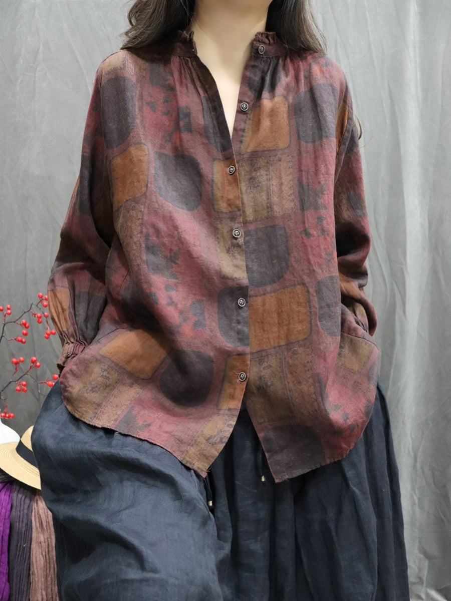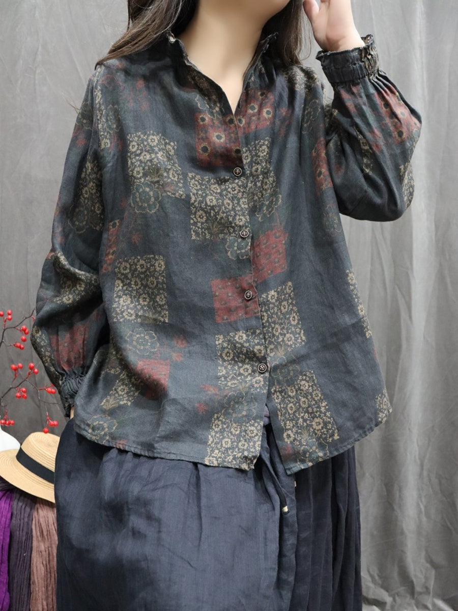 Chemise printanière pour femme, col montant, imprimé floral artistique, 100 % lin