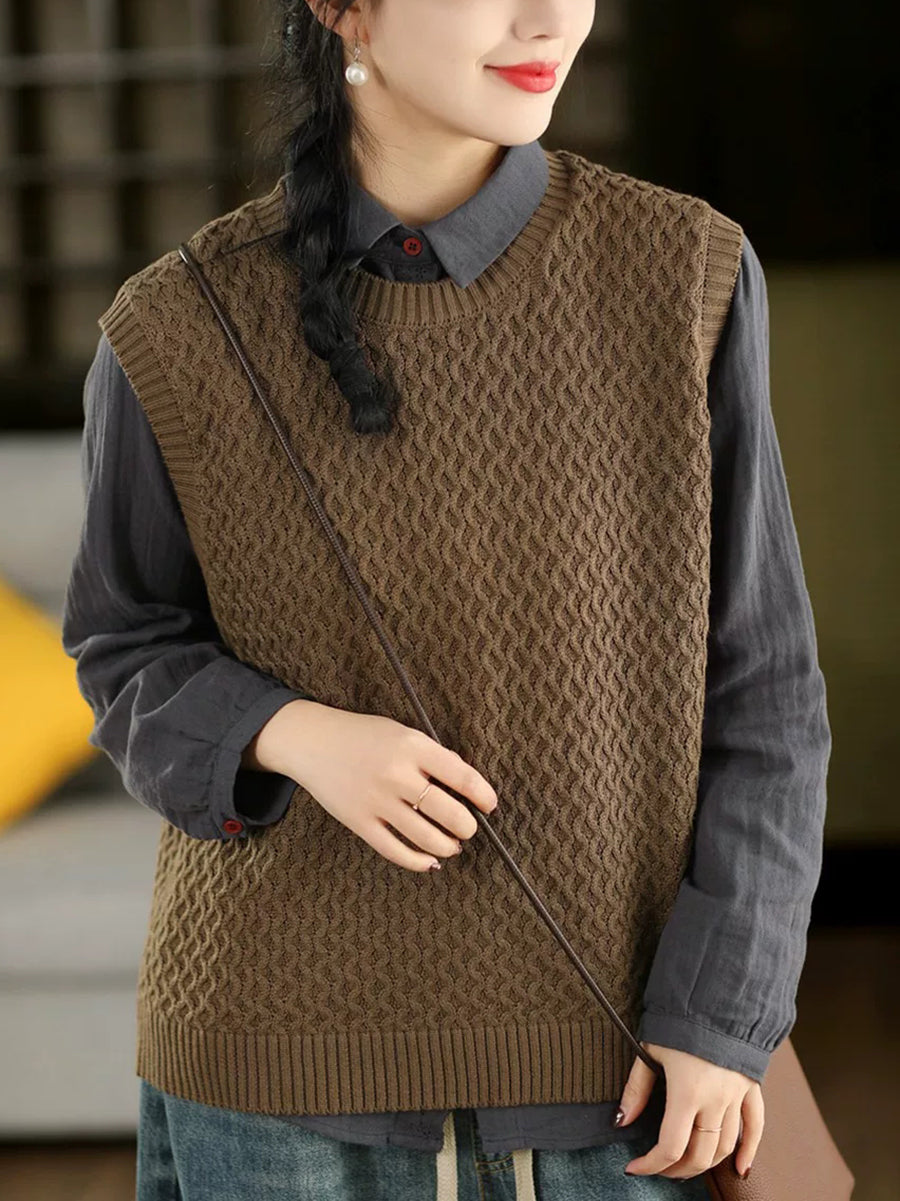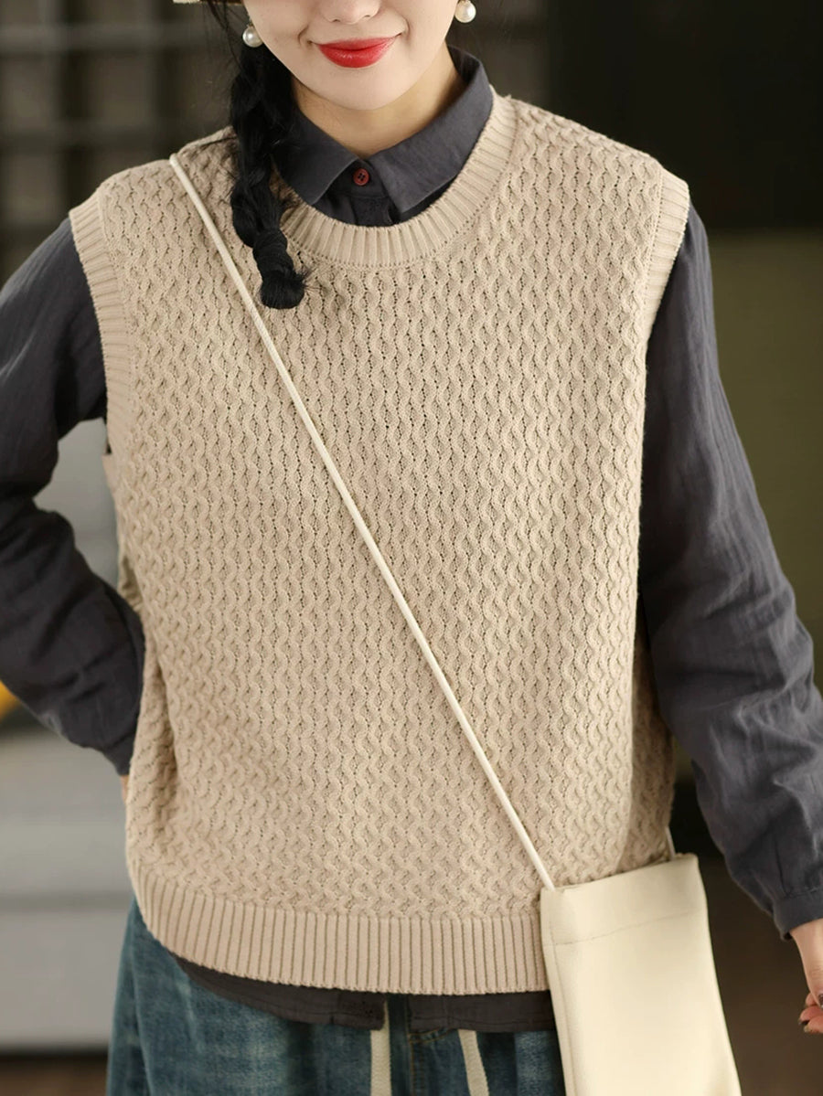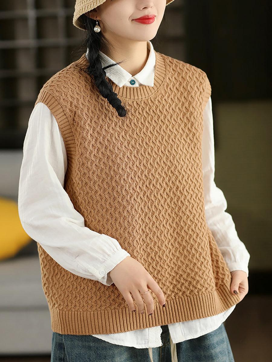 Gilet tricoté uni à col rond pour femme, style artistique, printemps