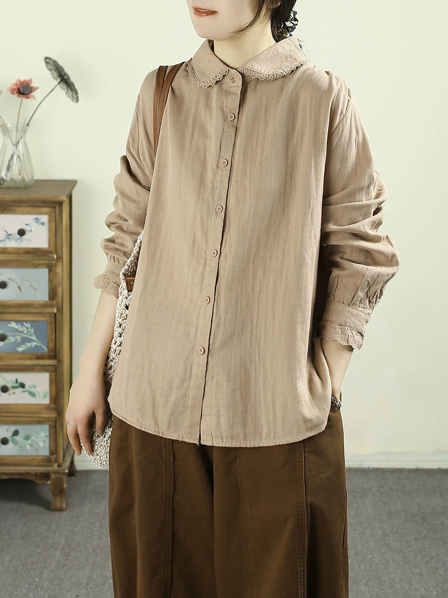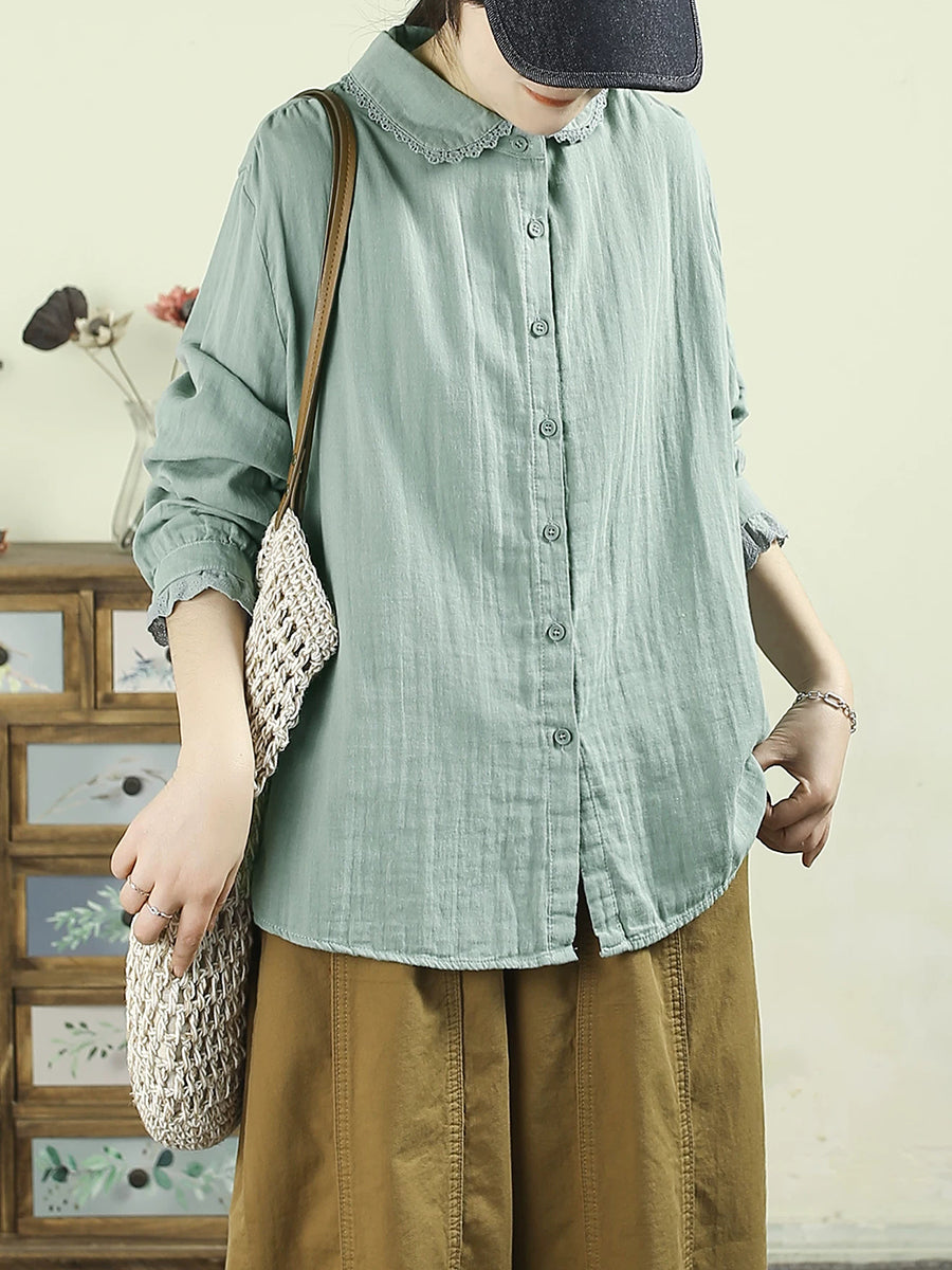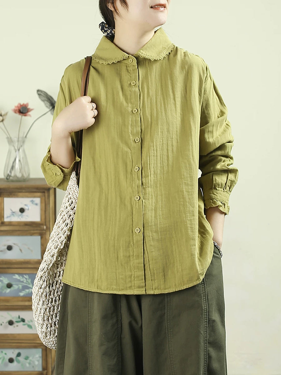 Chemise printemps femme style artistique, couleur unie, 100 % coton, col rabattu