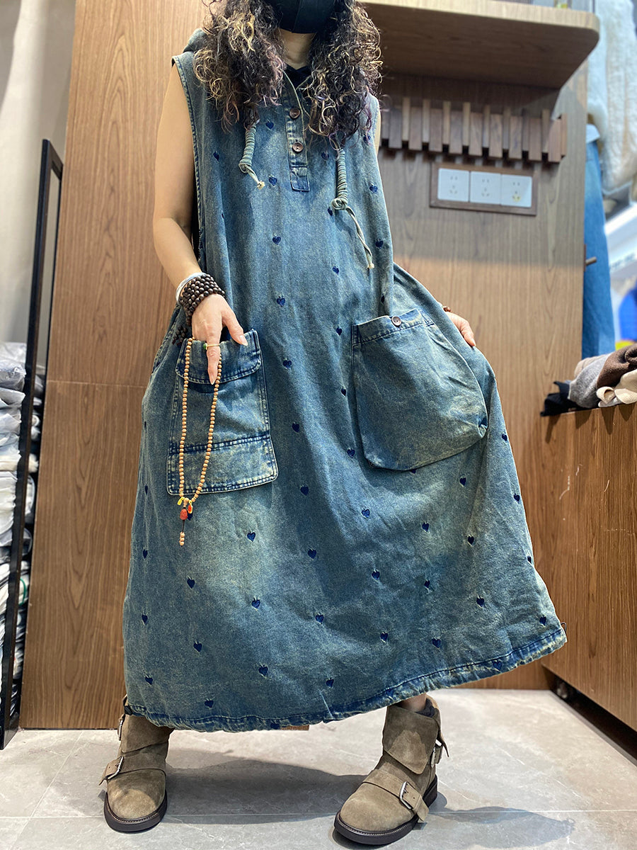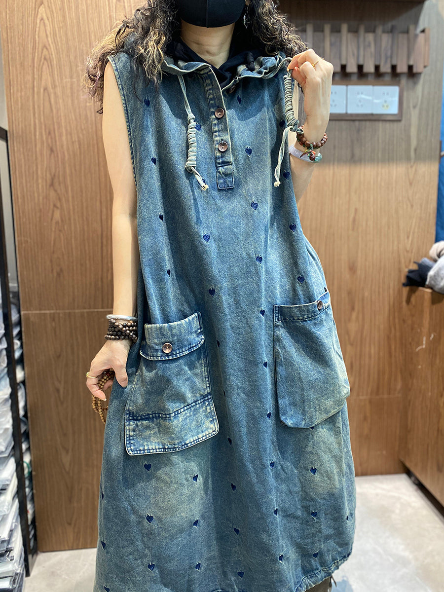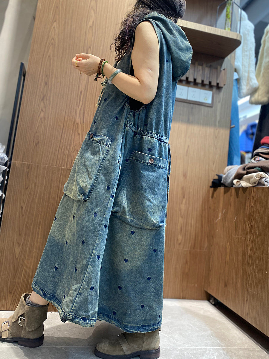 Robe sans manches en jean à capuche brodée de cœurs pour femme
