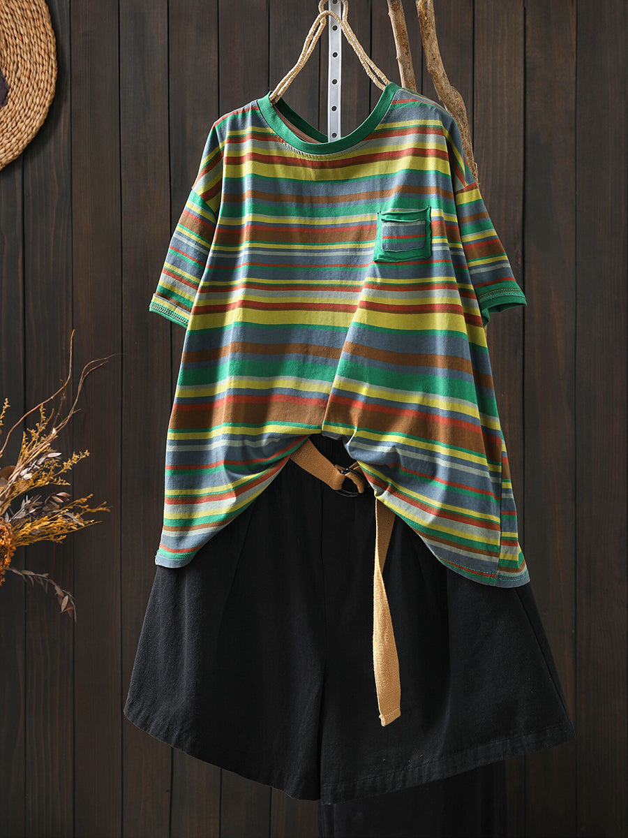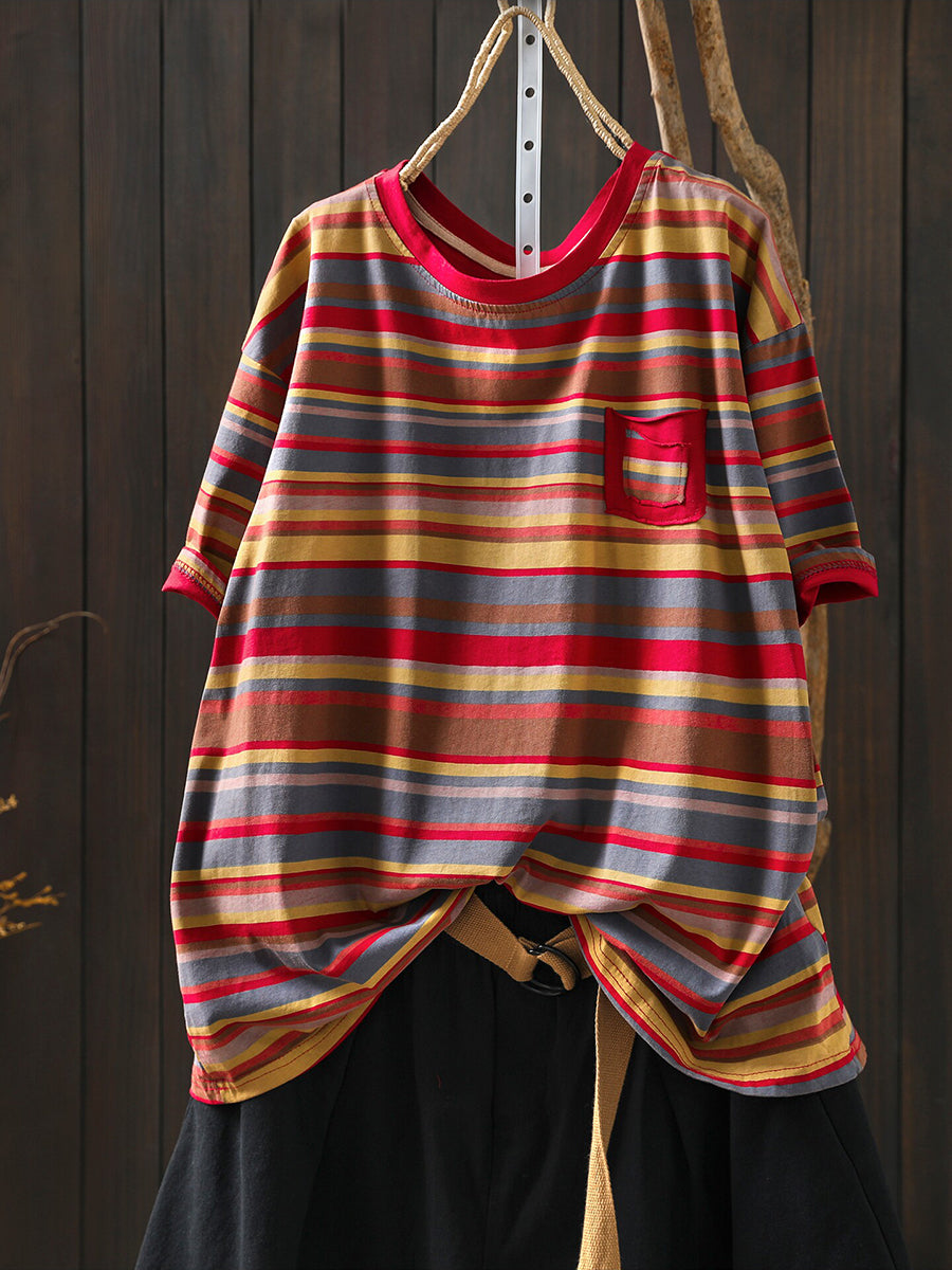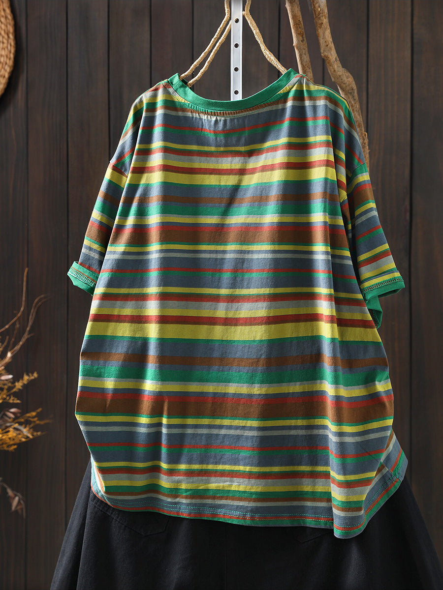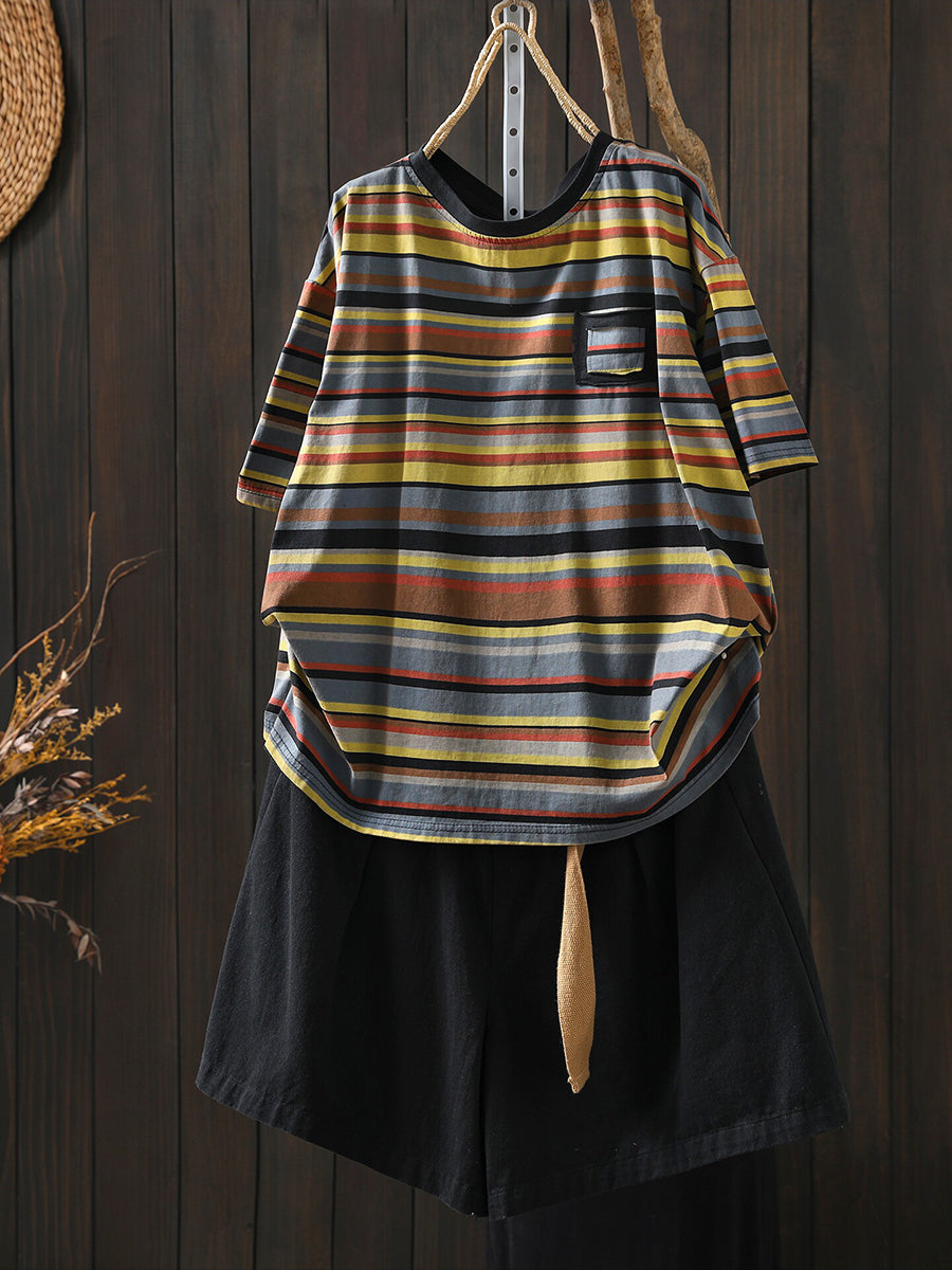 Chemisier d'été décontracté à rayures en coton pour femme, col rond, style rayé.
