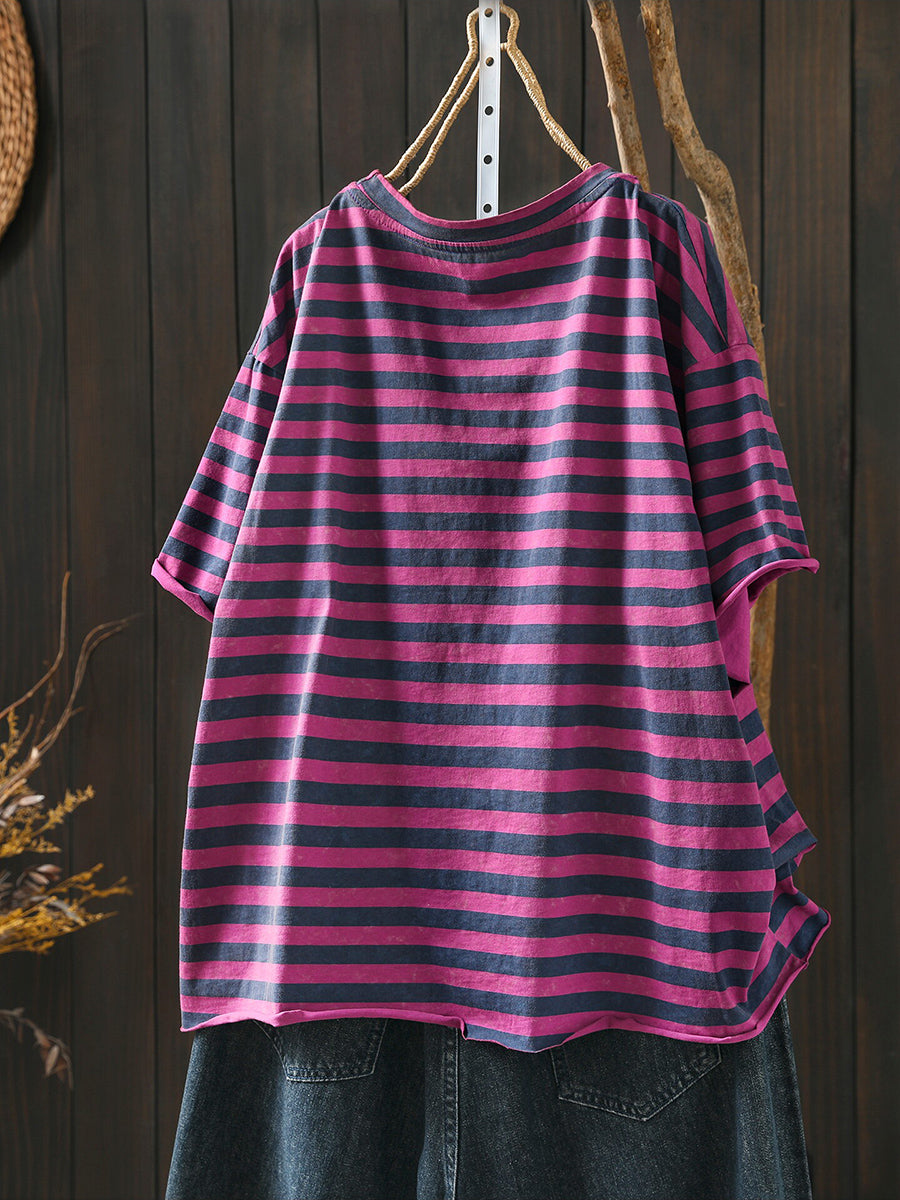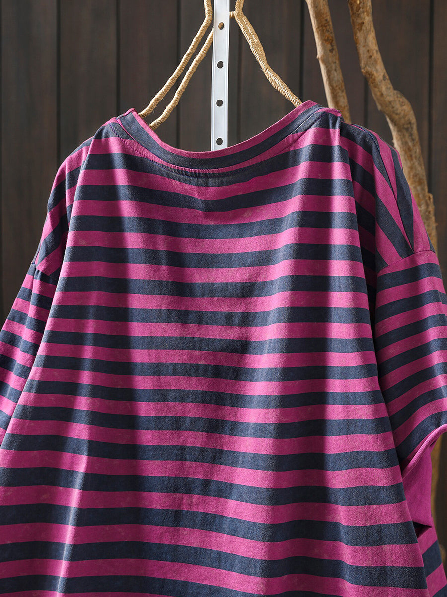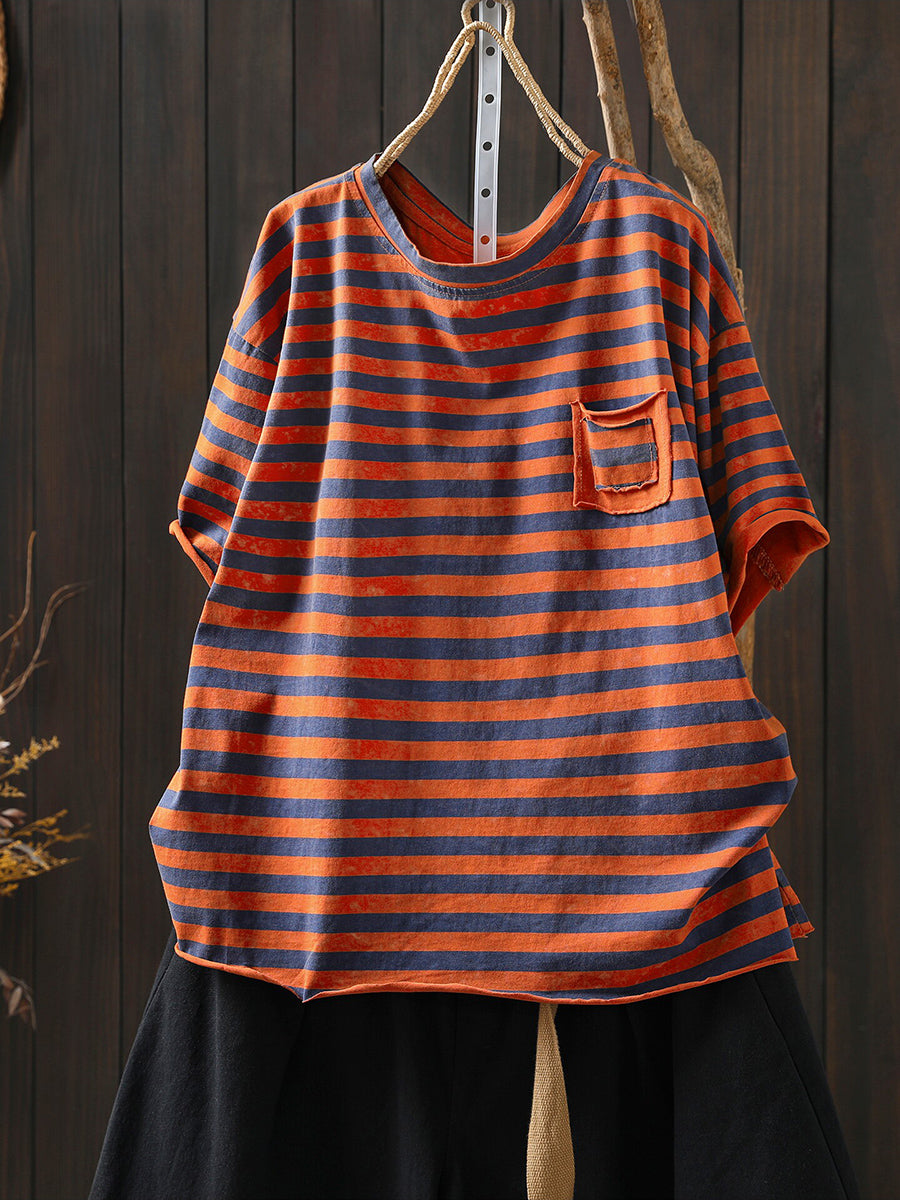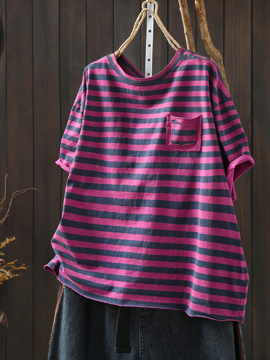 Chemise d'été décontractée à rayures et col rond pour femme