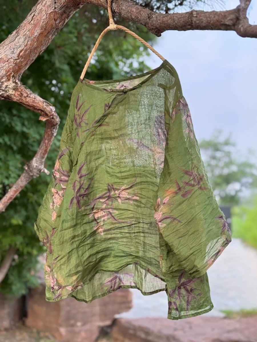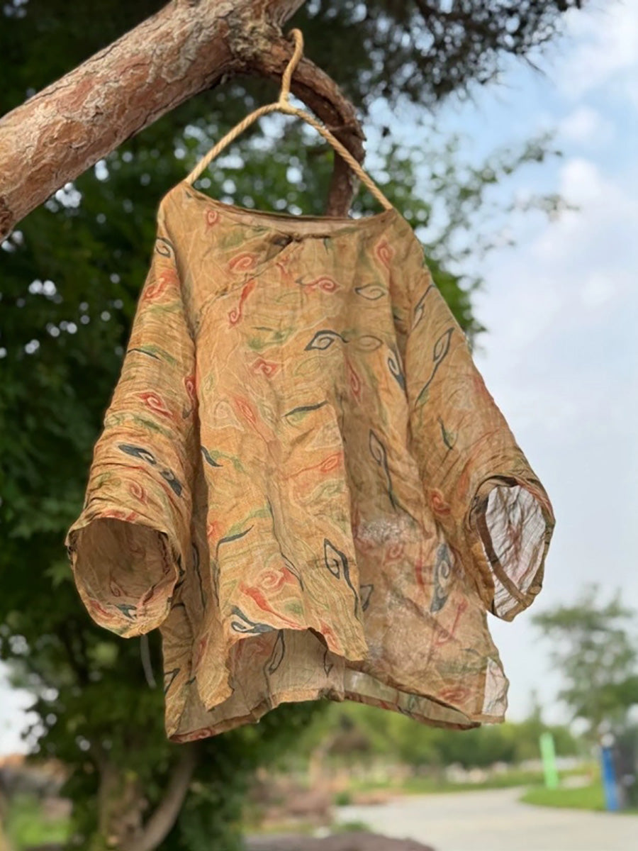 Chemise d'été à col rond en ramie à fleurs ethniques pour femme